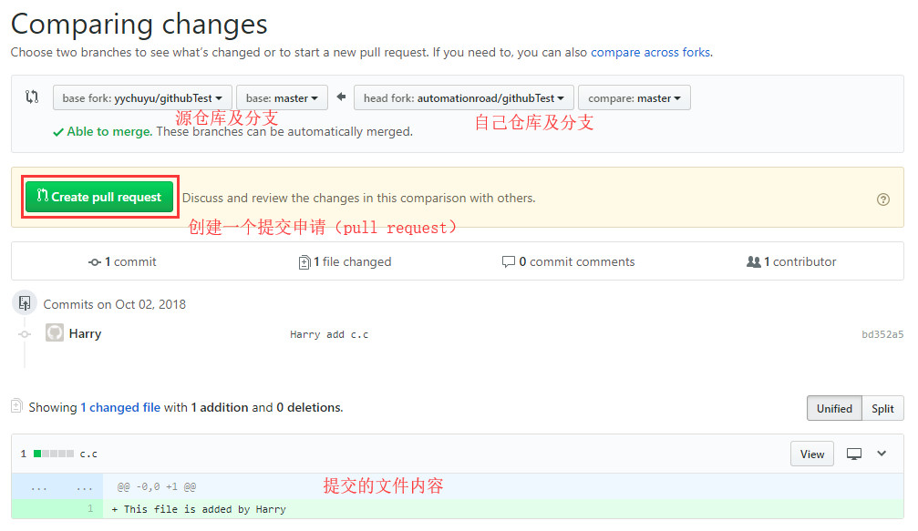 之后,gitHub会自动对源仓库分支及自己仓库分支代码进行比对,看看是否有冲突。如果它显示「Able to merge」的话,Harry就可以点击下面的「Create pull request」绿色按钮,进行代码提交。