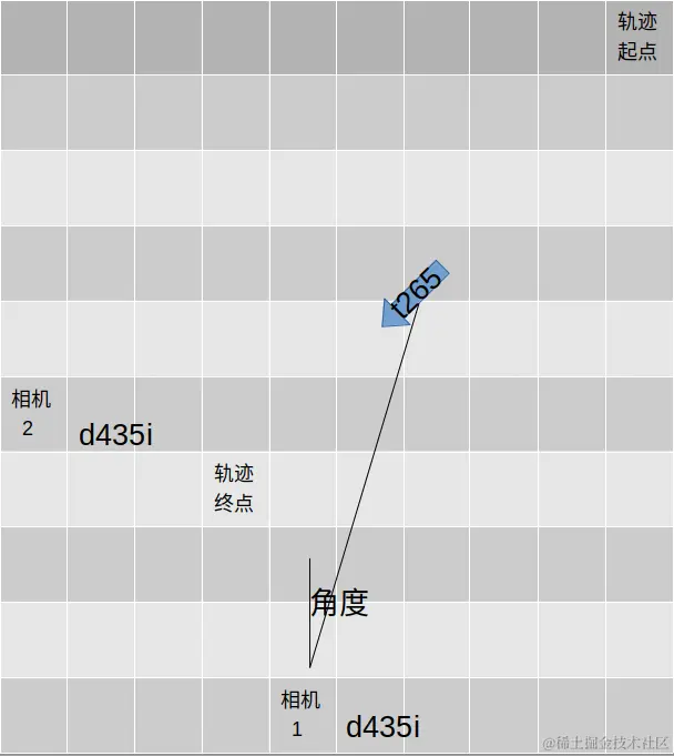 使用小车沿统一轨迹运动,分别在两个点放置摄像头,测试小车从起点运动到终点每一时刻的距离,通过t265获得小车从起点运动偏移的x,y坐标,从而求得小车的绝对x,y坐标,求得小车和相机的角度,如下图所示