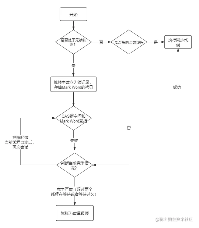 - 拷贝成功后,虚拟机将使用CAS操作尝试将对象的Mark Word更新为指向锁记录的指针,并将锁记录里的owner指针指向object mark word。如果更新成功,表示竞争到锁,则执行同步代码,否则执行步骤(5)。