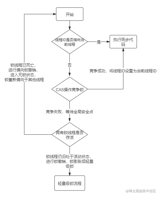 偏向锁只有遇到其他线程尝试竞争偏向锁时,持有偏向锁的线程才会释放锁,线程不会主动释放偏向锁。偏向锁的撤销,需要等待全局安全点(在这个时间点上没有字节码正在执行),它会首先暂停拥有偏向锁的线程,判断持有锁的线程是否处于活动状态。如果挂了,撤销偏向锁后恢复到无锁(标志位为“01”)然后重新偏向新的线程, 如果还活着,就升级为轻量级锁(标志位为“00”)的状态。