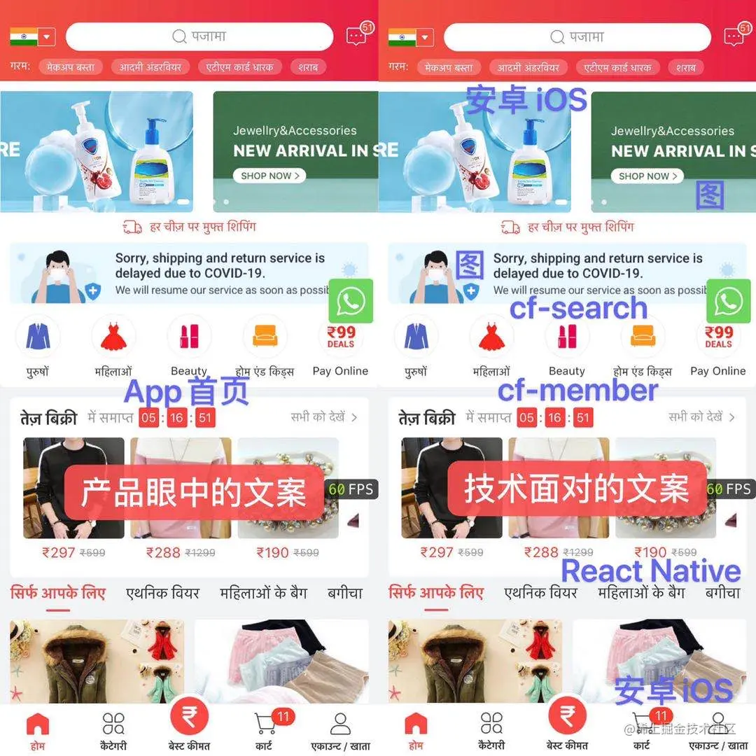 在App从实现简单翻译,到最高优先级要求全链路完整翻译印地语的需求转变中,App背后的技术架构已经发生了巨变。大前端有安卓iOS,RN,front-xxx,pc/m站等项目,后端有各个cf-xxx的微服务应用,其中已经多多少少渗透了App内需要展示的文案。这些文案,有的来源于产品需求、交互设计,有的由大数据挖掘而来,散落在代码的各个角落,简直春风吹又生。但幸运的是,这些野草基本都是可控的,“基本”两个字没法自信地去掉,主要是由于对于商品标题等信息的翻译,似乎还有待商讨。