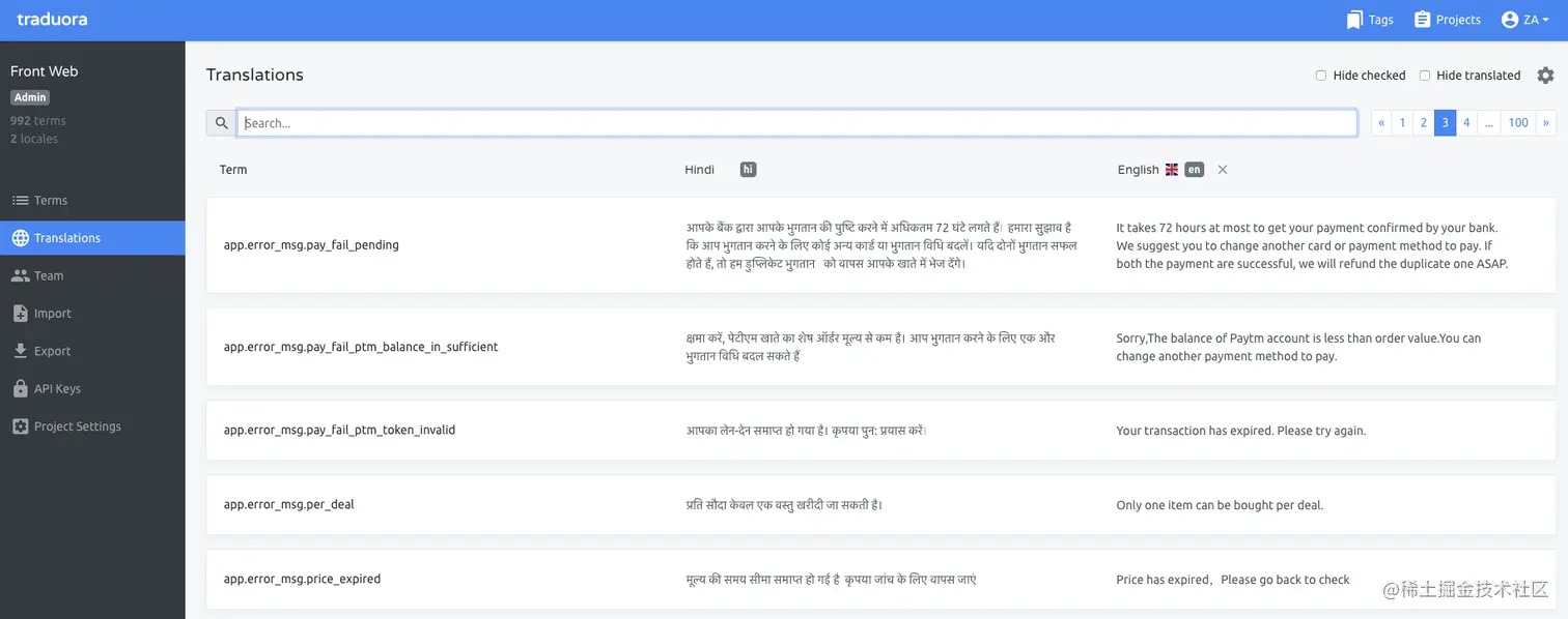 front-web是前端h5项目,我们为它在平台上创建一个Project。其中,app.error_msg.pay_fail_pending、app.error_msg.per_deal等就是这个项目里的词条,HIndi和English分别为这个项目的两个Locale,其中对应的值,也就是此词条对应该语言的翻译文案Translation。