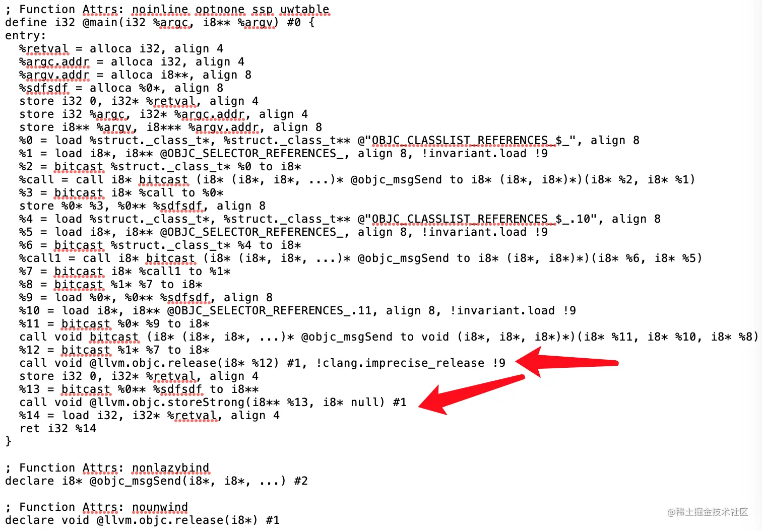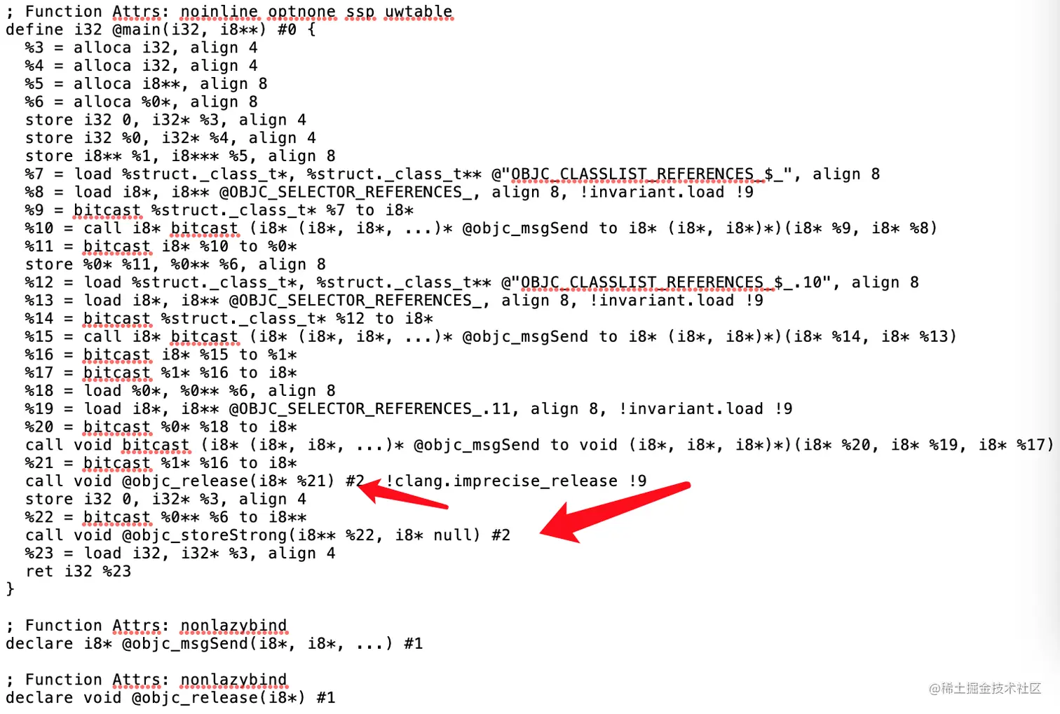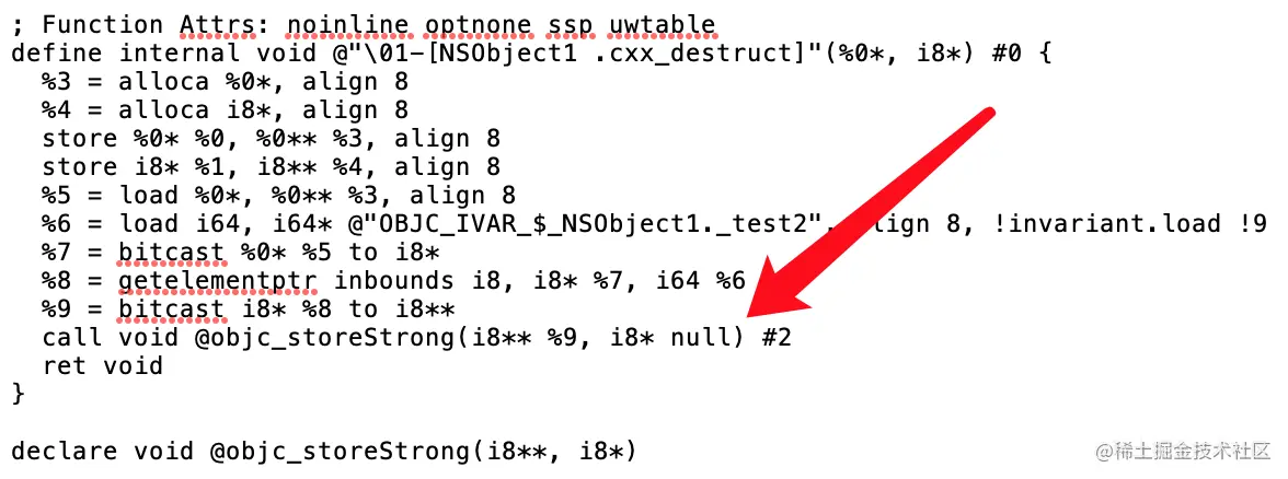 使用新版本的 Clang 对 strong 产生的 IR 码与 Apple LLVM version 10.0.1 (clang-1001.0.46.4) 明显不同。采用 @llvm.objc.* 后,在从 IR 为各个目标机器生成机器码时,形如 @llvm.objc.* 的函数可能得到直接硬件级别的优化提升。