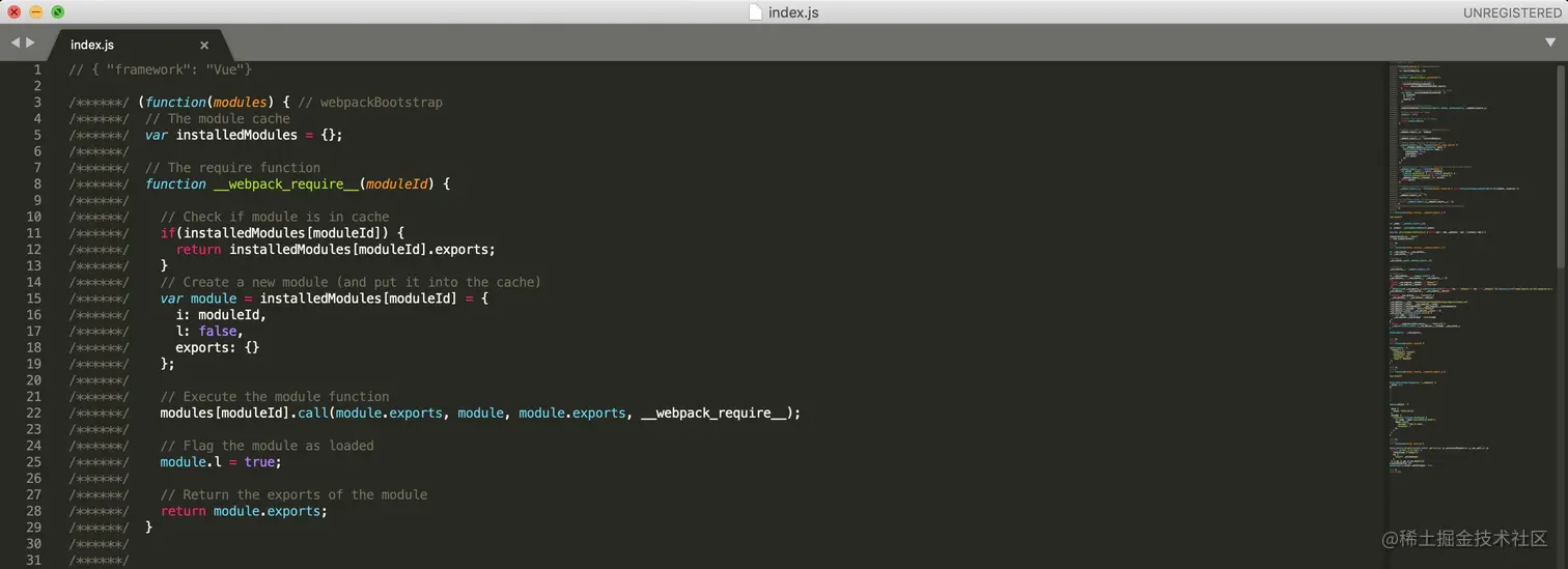 Demo很简单,一个TextView,点击事件弹了个toast。写法上也基本是标准的Vue结构,经过webpack打包后index.vue变成了index.js:
