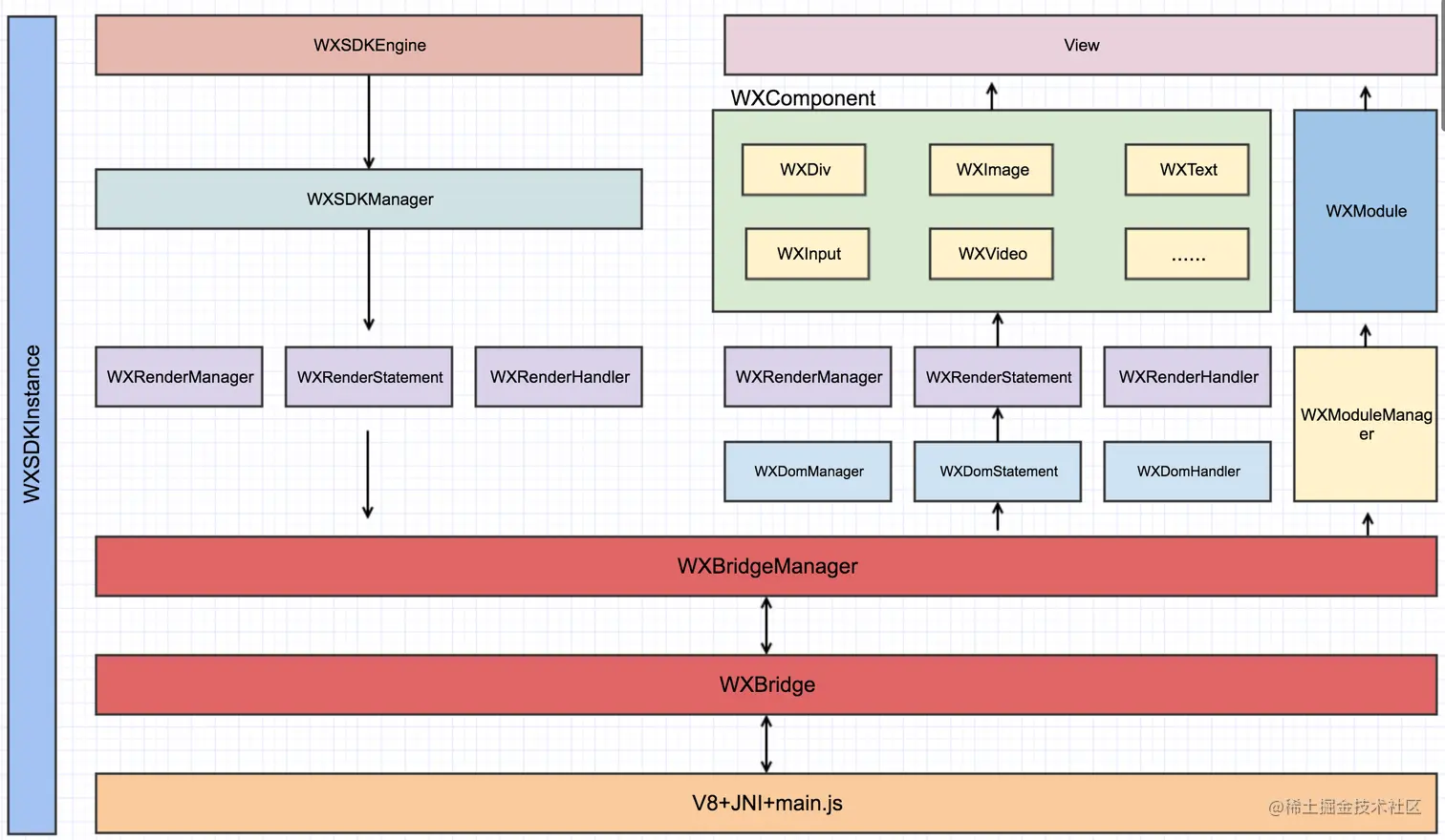 - WXBridgeManager:JS Bridge的管理者,JS调用WXBridge的代码后都是交给Manager完成的