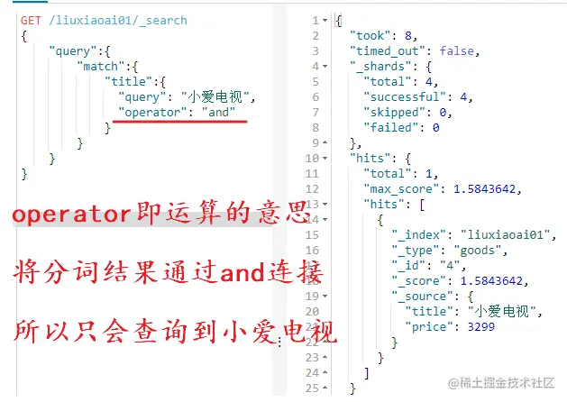 如果说明是and连接,那么查询到的数据分词必须要包含“小”,“爱”和“电视”。