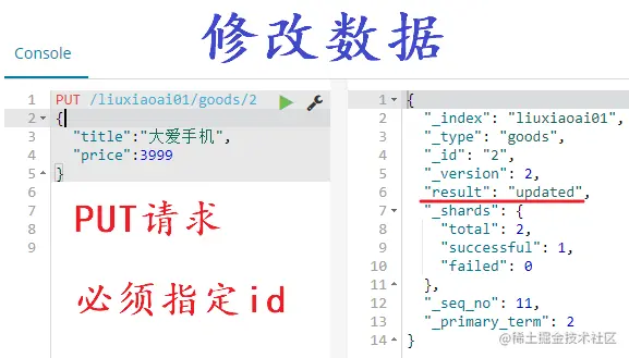 - 如果id在文档中不存在,则新增该数据,就相当于通过POST添加了一条数据。