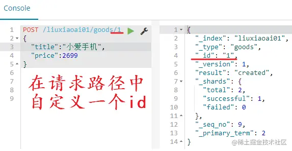 关于请求路径:索引库是liuxiaoai01,索引类型goods,id为1,添加了一条数据。