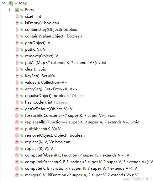 值得注意的是,Map里面定义了一个Entry类,其实就是定义了一个存储数据的类型,一个entry就是一个<key,value>.