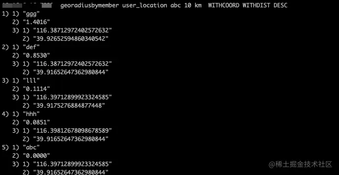 GEORADIUSBYMEMBER:与GEORADIUS命令类似,给定中心位置,查询附近的地理位置元素,与GEORADIUS命令不同的是,这个命令的中心点是某个成员,是从用户的维度来查询。