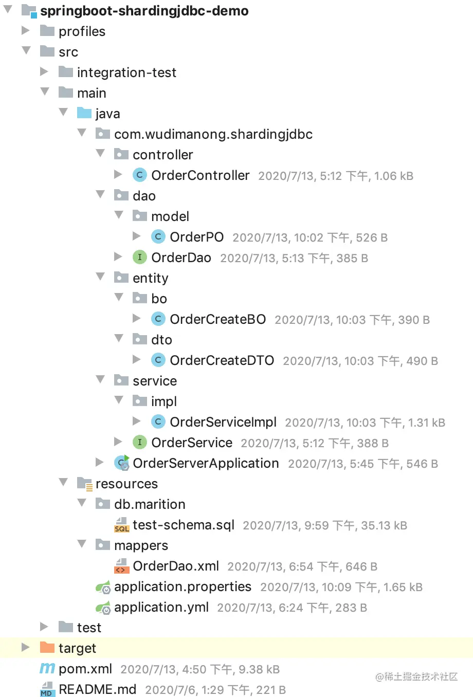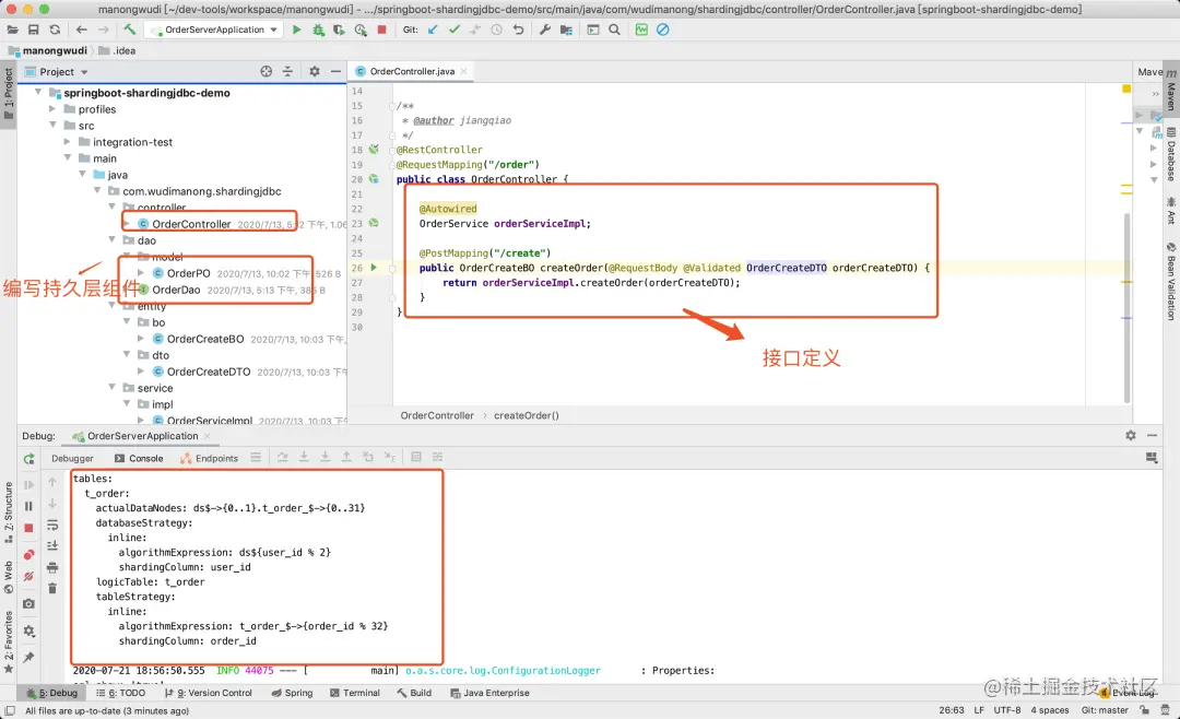 通过上述步骤,到这里我们已经从功能上完成了针对订单表的分库分表逻辑。具体针对订单表的操作逻辑,还是和正常使用Mybatis操作数据库表一样,并不需要针对分库分表进行额外的代码操作,因为ShardingJdbc会在数据库驱动层拦截SQL并进行分库分表规则的匹配及路由操作。