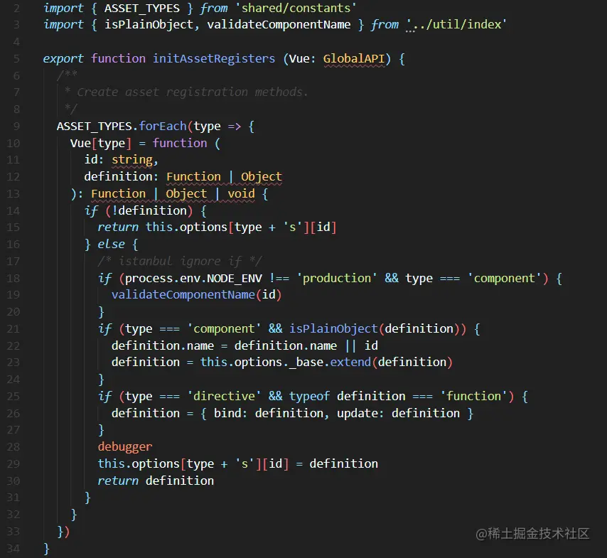 1.在Vue初始化的过程中会执行initAssetRegisters函数并把Vue当成参数传入,执行的过程中遍历ASSET_TYPES数组,该数组存放了三个参数['component','directive','filter']将每一个参数都定义在Vue上并赋值为函数,函数的入参是id(传入的组件name)和definition(传入的组件,可以是函数或者对象),函数的执行逻辑是当definition不存在时直接返回Vue.options.components.id(组件对象)。