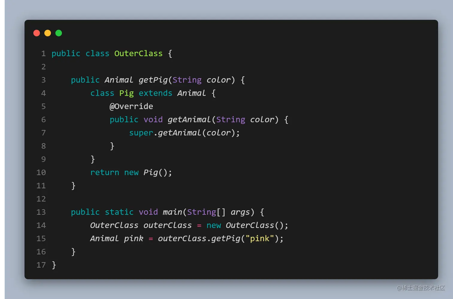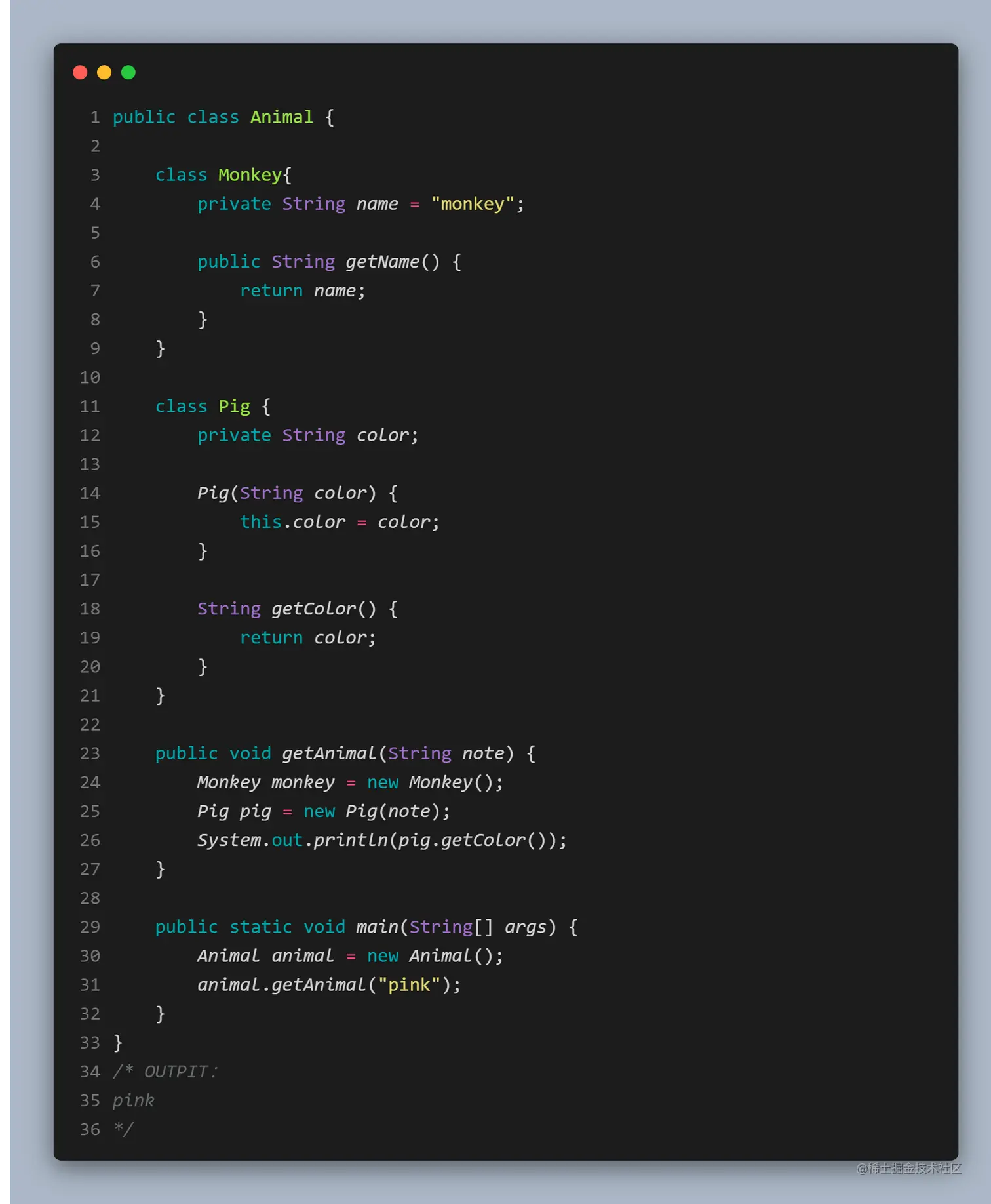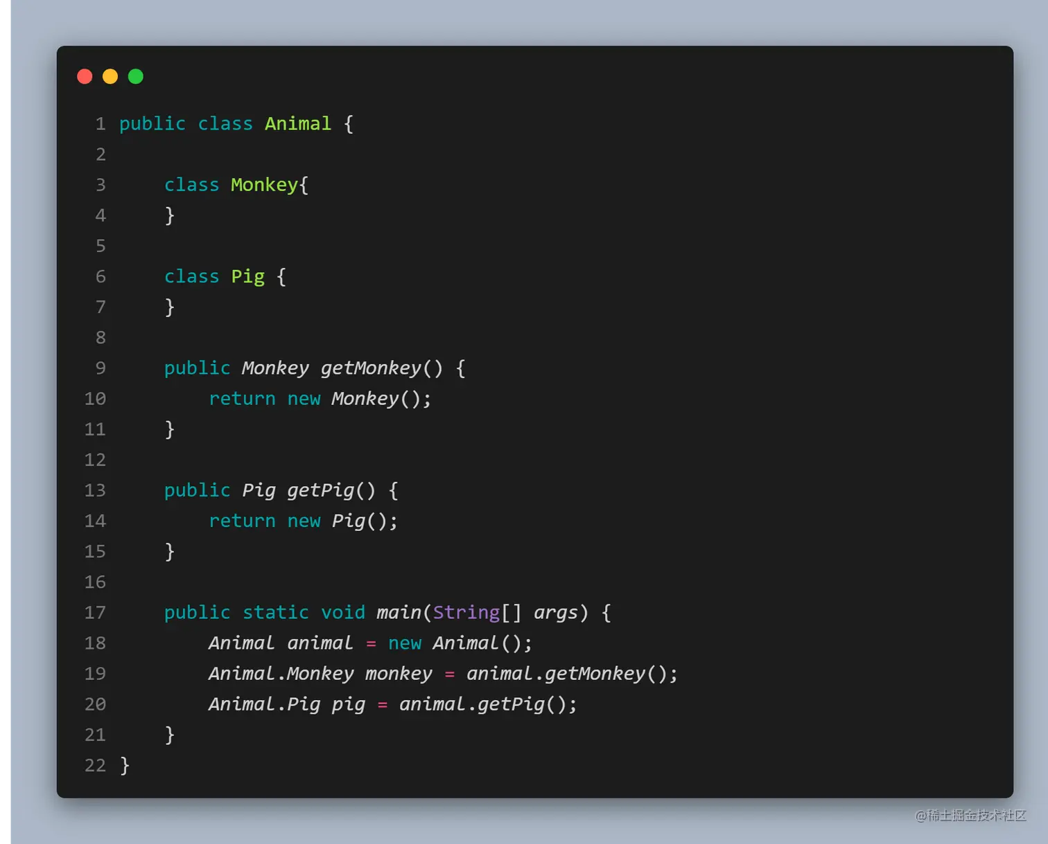 通过定义方法,来返回执行内部类的引用。不知道细心的小伙伴有没有注意到内部类的引用有点奇怪:Animal.Monkey。这也是内部类的区别之一,如果要在外部类的非静态方法之外获取某个内部类的对象,需要「具体指明这个对象的类型」:OuterClassName.InnerClassName