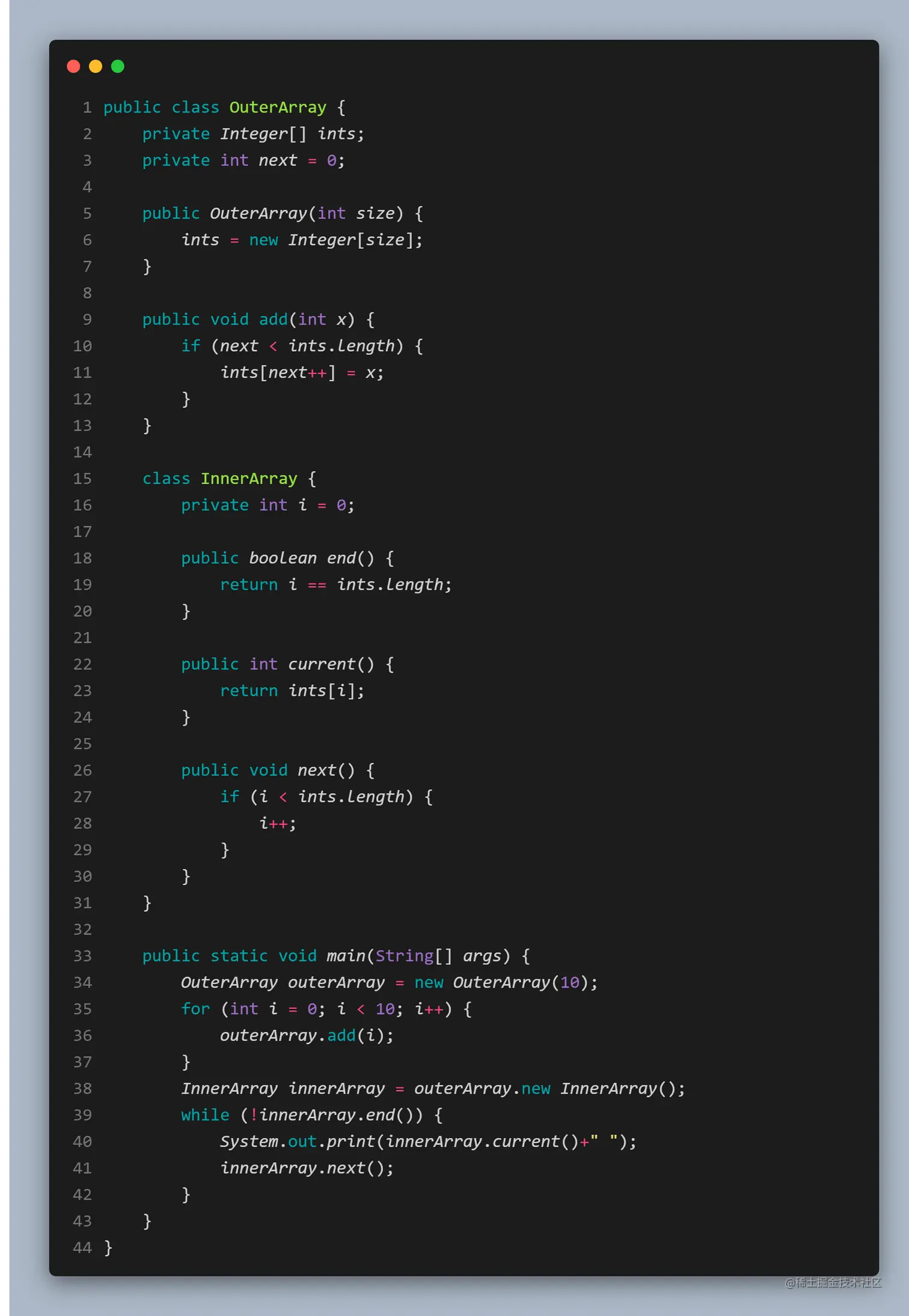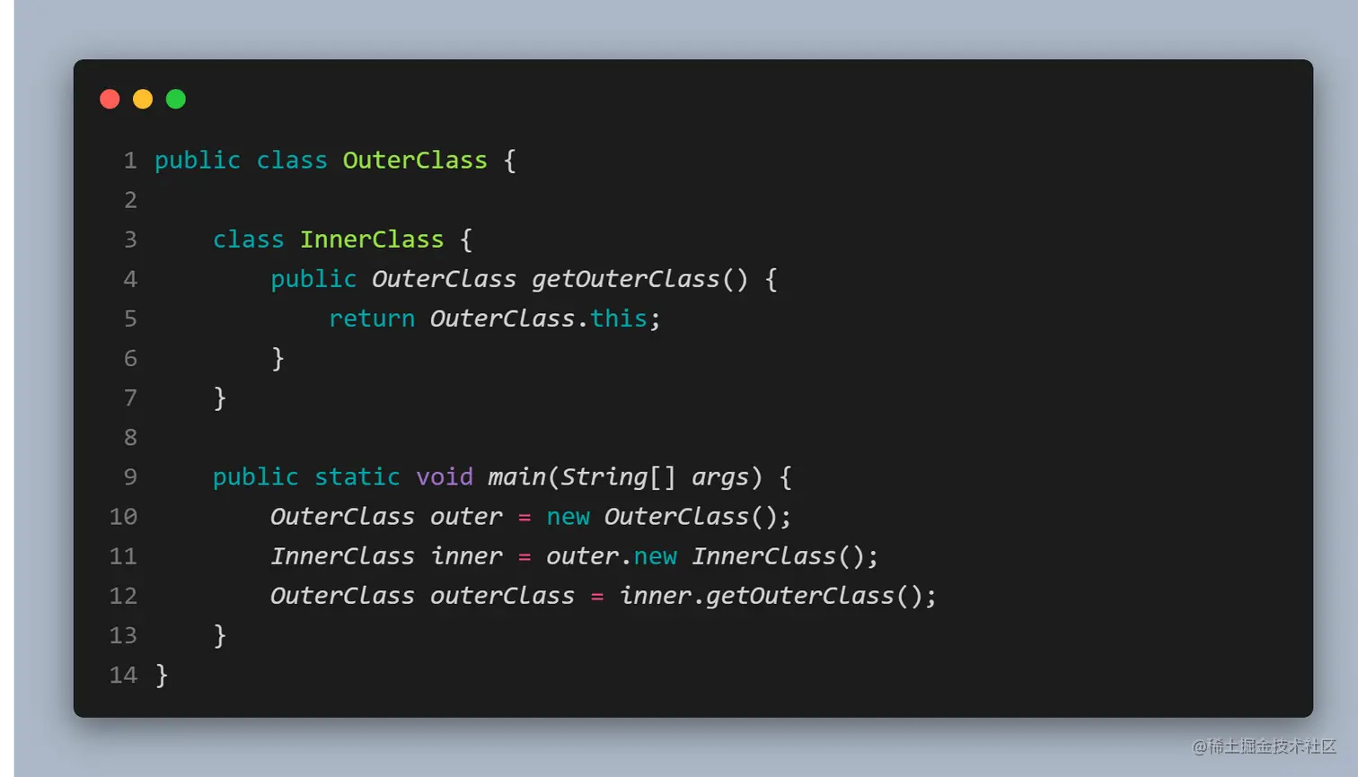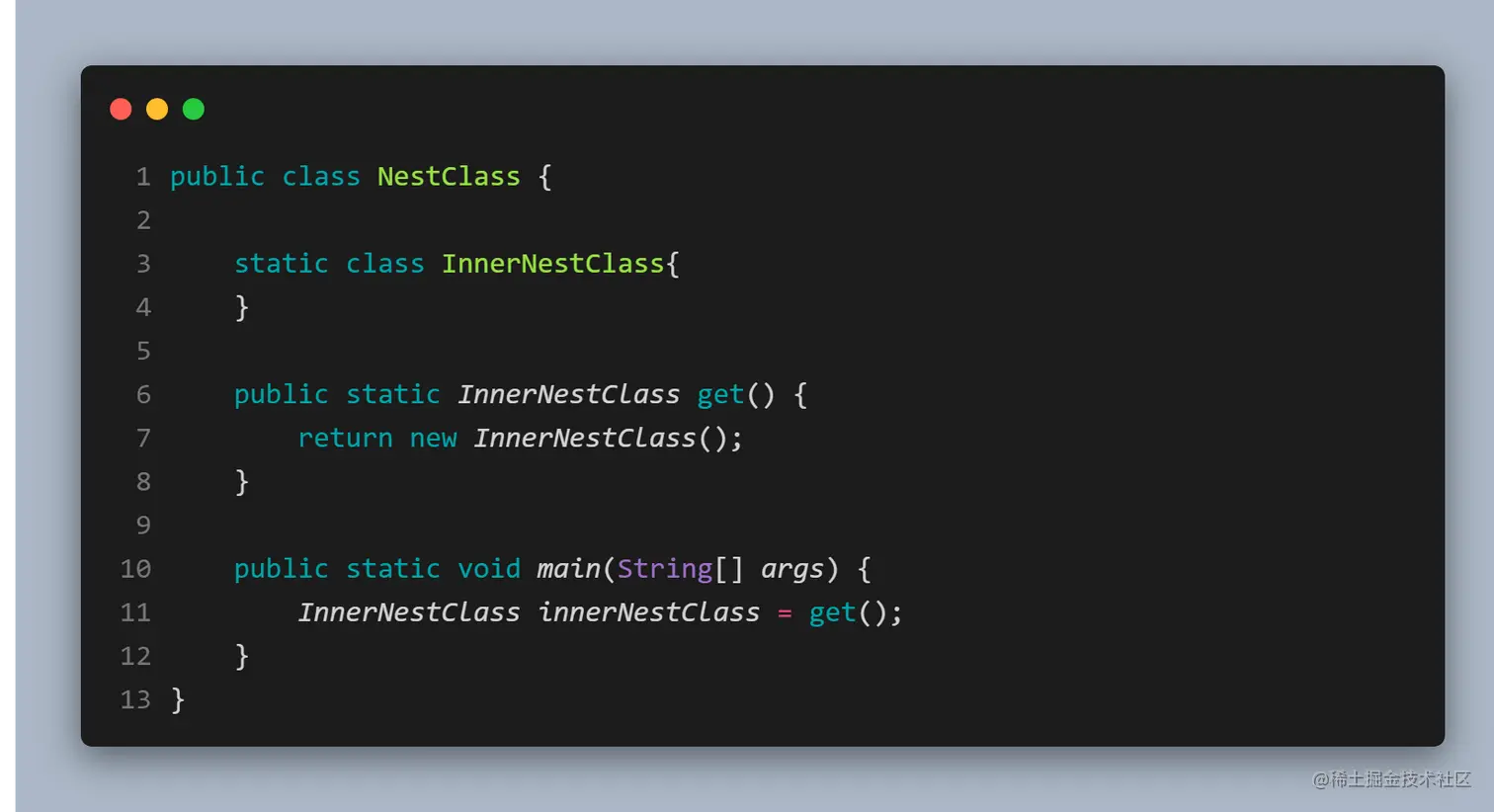 通过定义方法,来返回执行内部类的引用。不知道细心的小伙伴有没有注意到内部类的引用有点奇怪:Animal.Monkey。这也是内部类的区别之一,如果要在外部类的非静态方法之外获取某个内部类的对象,需要「具体指明这个对象的类型」:OuterClassName.InnerClassName