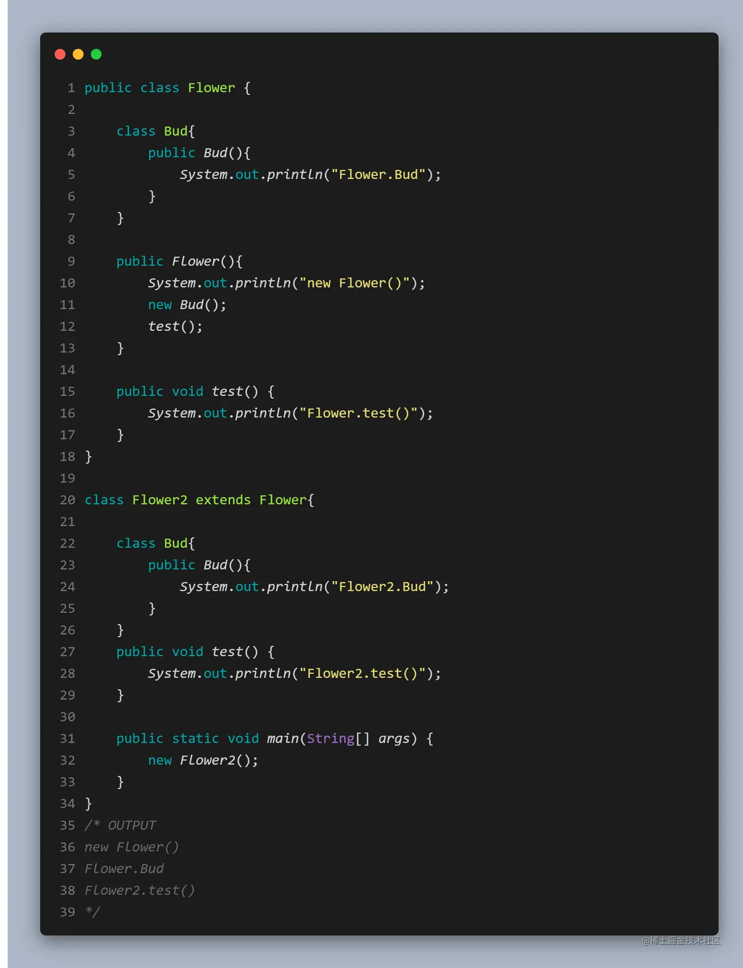 当我们需要OuterClass对象的时候,我们顺手就来了个new OuterClass(),但是如果我们需要的是InnerClass对象,那么又该如何处理呢?答案便是: