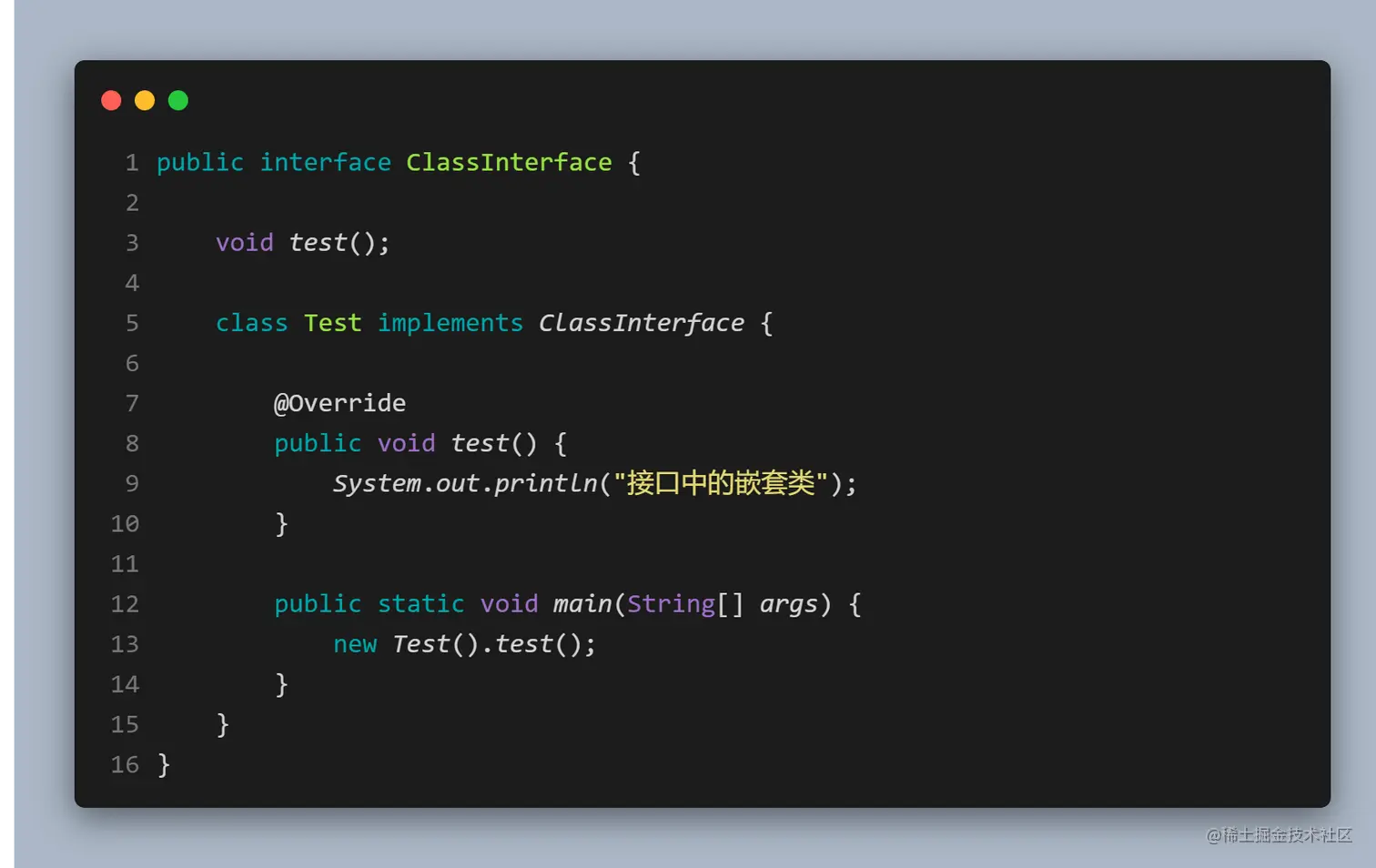正常情况下,不能在接口内部放置任何代码,但嵌套类可以作为接口的一部分。你放到接口中的任何类都自动是public和static的。因为类是static的,只是将嵌套类置于接口的命名空间内,这并不违反接口的规则。你甚至可以在内部类中实现其外部类的接口:
