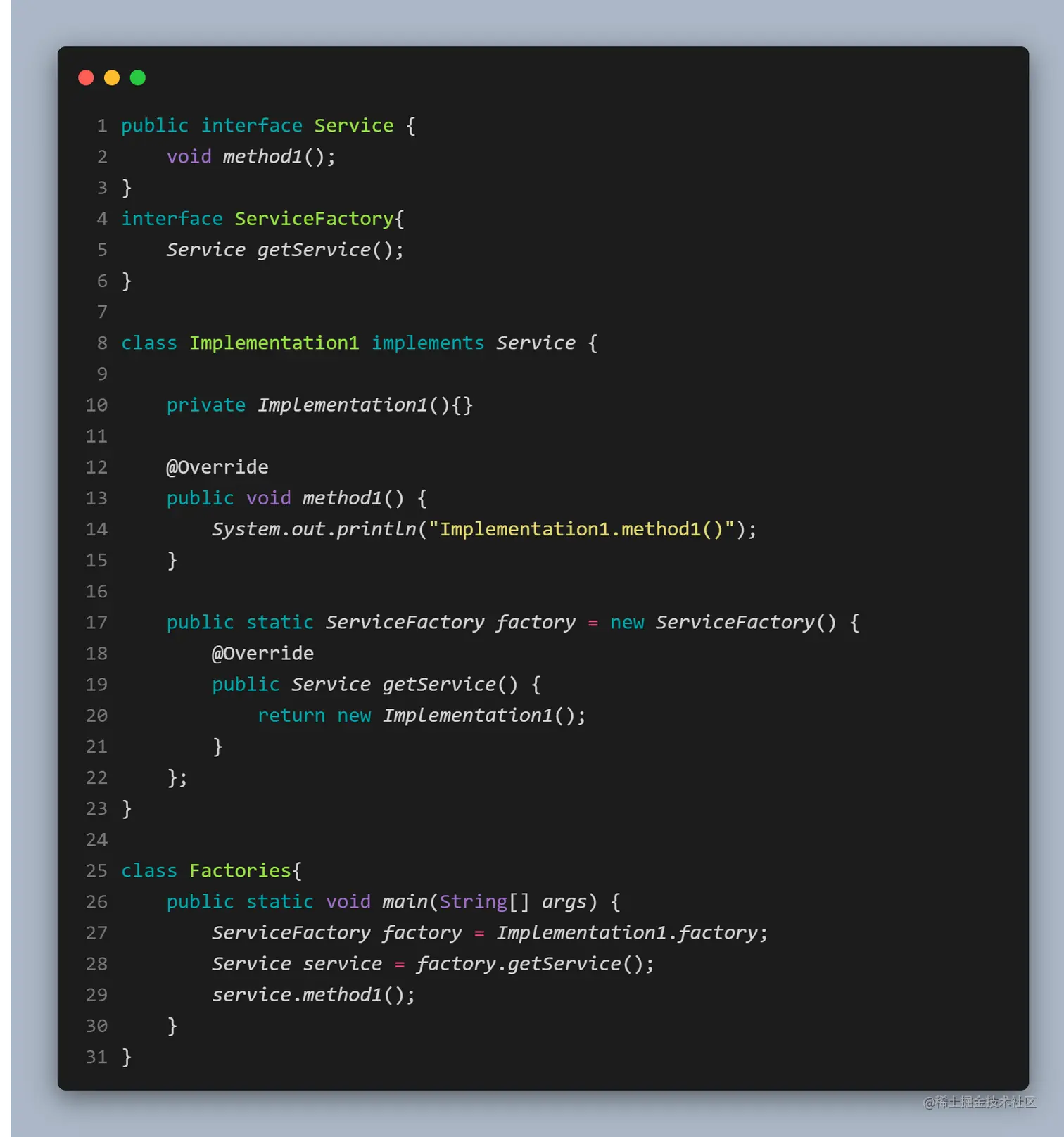 Implementation1的构造器都可以是private的,并且没有任何必要去创建作为工厂的具体类,这样所产生的语法也更具有实际意义,也可以运用在单例模式中。