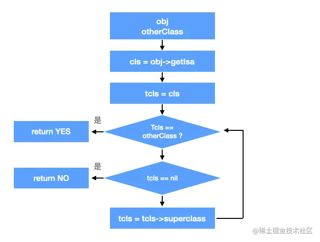 通过源码,我们可以看到,isKindOf方法的内部逻辑是当前类指向的元类的继承链 与 要对比的类 进行比较