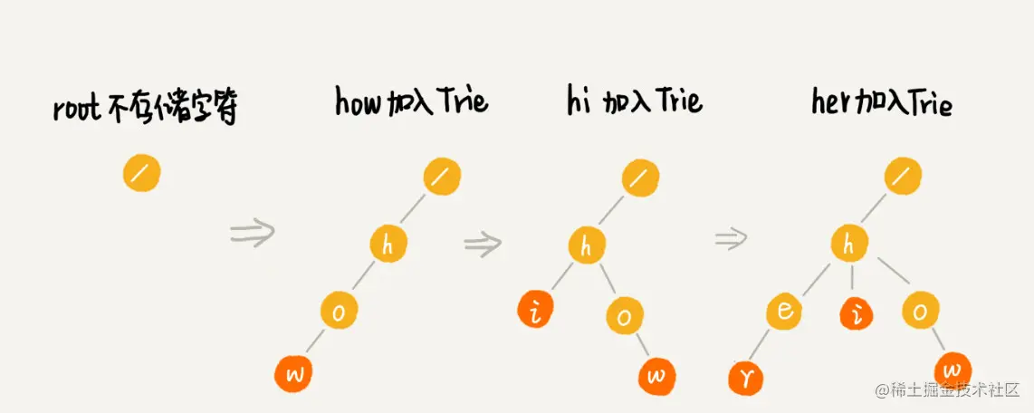 其中,根节点不包含任何信息。每个节点表示一个字符串中的字符,从根节点到红色节点的一条路径表示一个字符串(注意:红色并不都是叶子结点)。