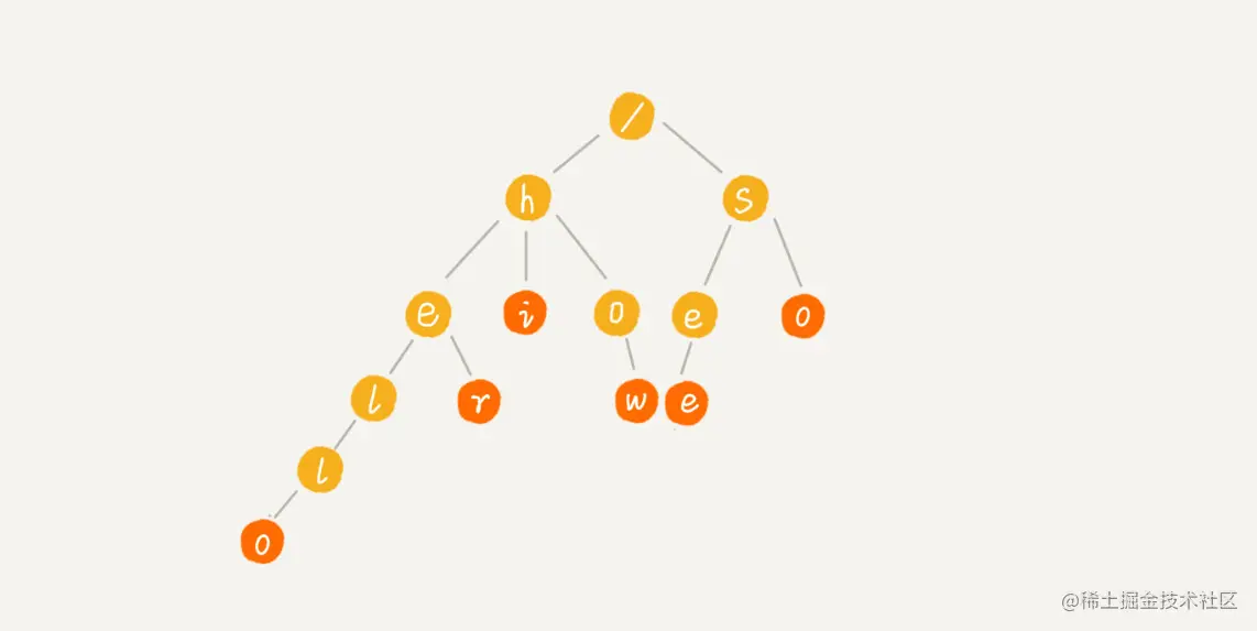 举个例子,我们有 6 个字符串,分别是:how、hi、her、hello、so、see。我们希望在里面多次查找某个字符串是否存在。如果每次查找,都是拿要查找的字符串跟着 6 个字符串依次进行字符串匹配,那效率就比较低,有没有更高效的方法呢?