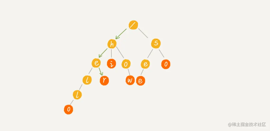 当我们在 Trie 树种查找一个字符串 her 的时候,那我们将要查找的字符串分割成单个的字符 h e r,然后从 Trie 树的根节点开始匹配。过程如图所示,绿色的路径就是在 Trie 树中匹配的路径。