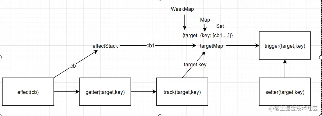 targetMap.set(target, depsMap) // 对应数据结构: target | depsMap
