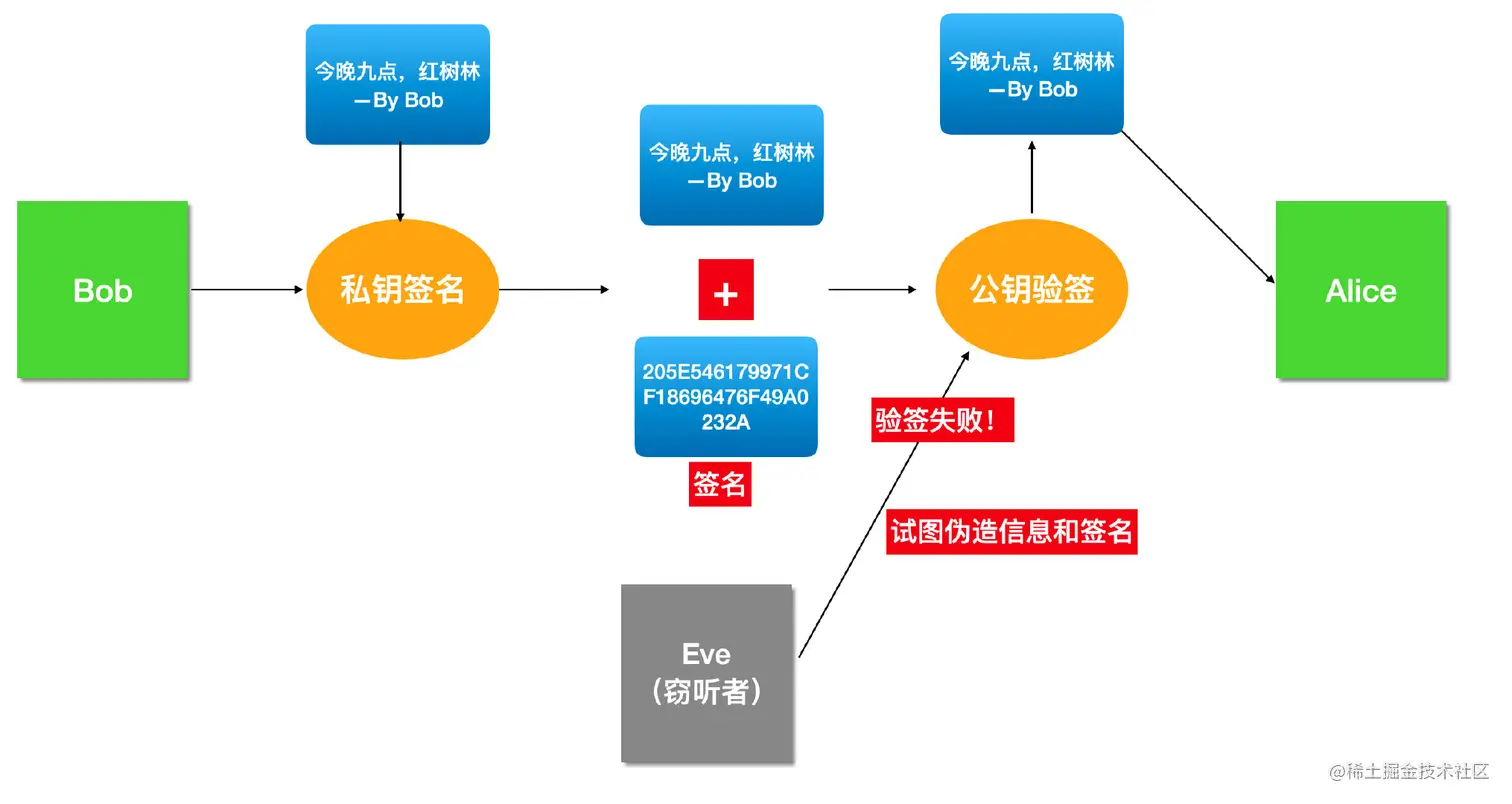 那么 Eve 可能篡改内容并冒充 Bob 的签名吗?不可能!因为内容发生改变时,对应的签名也需要重新计算,而签名的生成依赖于私钥,只要 Bob 的私钥不泄露,签名就不会被冒充。
