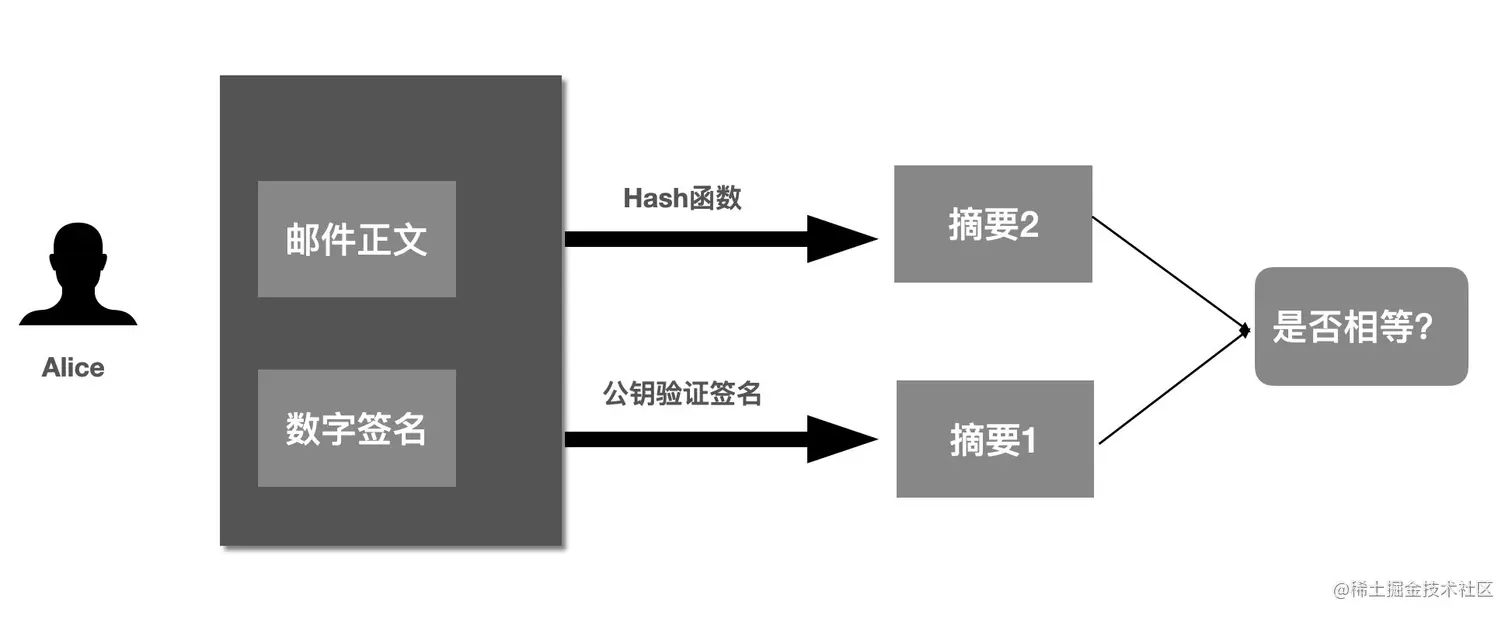 再对邮件内容使用相同的散列函数计算「摘要2」,与上面得到的「摘要1」进行对比,两者一致就说明信息未被篡改。