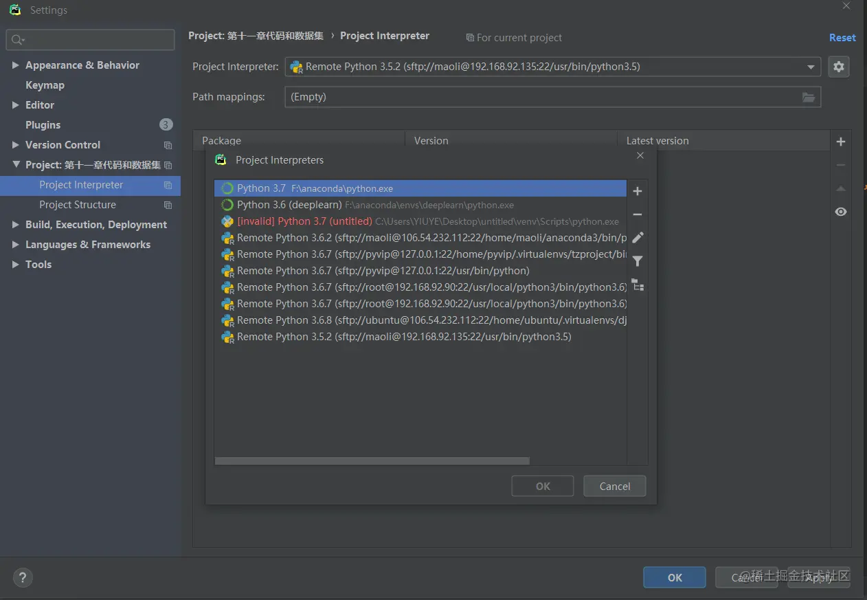 咋RunsenPycharm中设置了有anacodna的 python.exe ,有远程的python.exe,有直接下载的python.exe