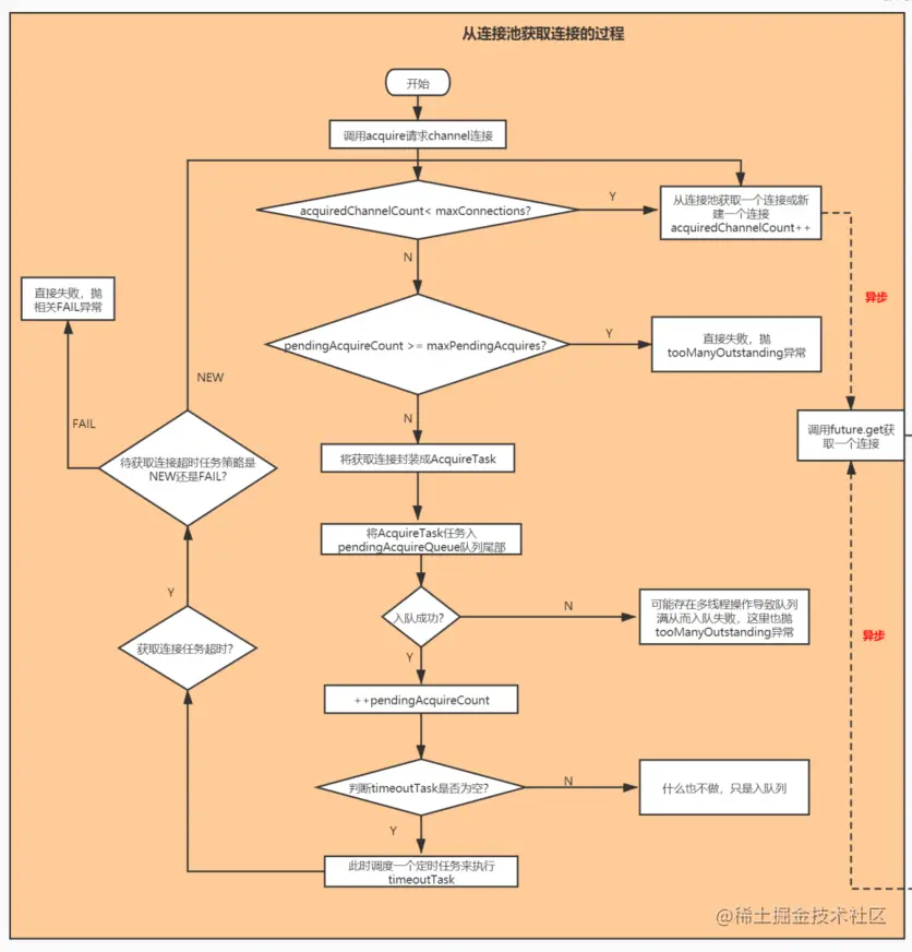 // 解决方案:需要实现AcquireTimeoutAction的NEW或FAIL策略,因为您实现的代码创建FixedChannelPool连接池时AcquireTimeoutAction参数传的是null
