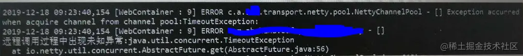 根据报的异常信息可用判断是在进行远程调用前调用CustomChannelPool.acquire方法的Channel ch = fch.get(timeoutMillis, TimeUnit.MILLISECONDS);这句代码从Netty连接池获取连接超时(即10秒后),然后抛出TimeoutException,最后再在CustomChannelPool.acquire方法的catch代码块打印出Exception accurred when acquire channel from channel pool:TimeoutException异常信息,然后再把该异常往外抛出去,即最后会在BusineseService的标号【5】处的代码Channel channel = CustomChannelPool.fixpool.acquire(10000); 抛出了一个TimeoutException异常,又因为标号【5】处的代码没有包含在try块内,因此不会执行标号【6】处的finally块释放连接的逻辑。