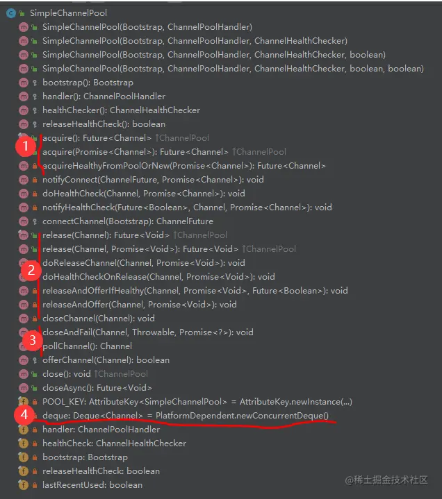 SimpleChannelPool实现了Netty的channel连接池的基本功能如获取连接,释放连接以及对channel连接进行健康检查等。此外,SimpleChannelPool是如何来存储channel连接呢?此时从上图的序号4可以看到定义了一个双端队列deque来存储channel连接。