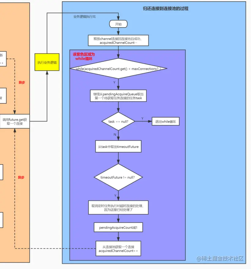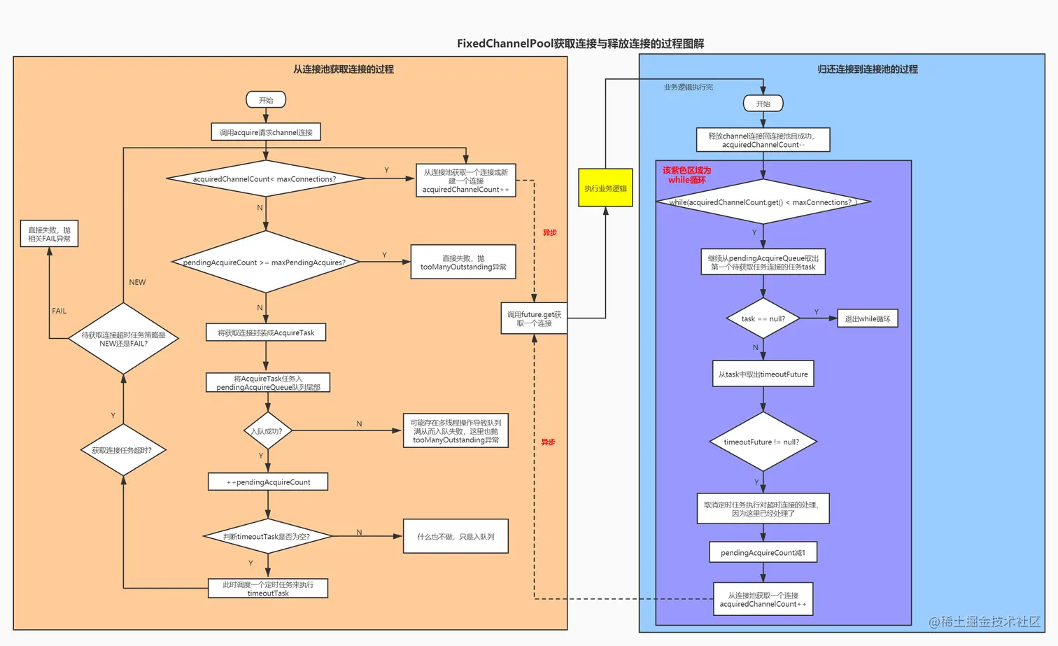 同样,以一个流程图来总结Netty连接池获取和释放连接流程: