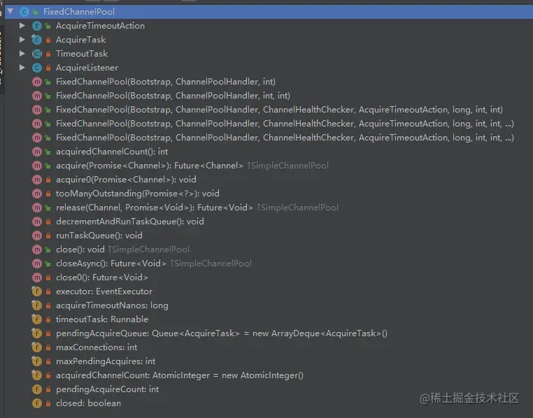 ArrayDeque类型的双端队列pendingAcquireQueue,当连接池可用channel连接耗尽时,待获取的连接会被封装成一个AcquireTask,然后pendingAcquireQueue队列就是用来存储AcquireTask的; - 成员变量