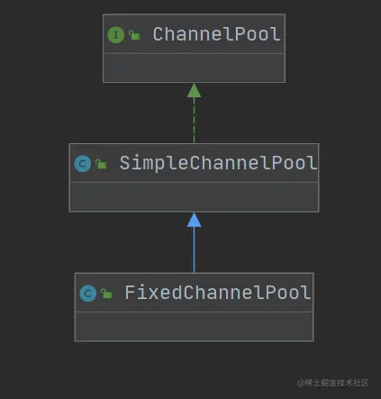 这里用到的是Netty的FixedChannelPool连接池,同时FixedChannelPool继承了SimpleChannelPool,而SimpleChannelPool又实现了ChannelPool接口,如下图: