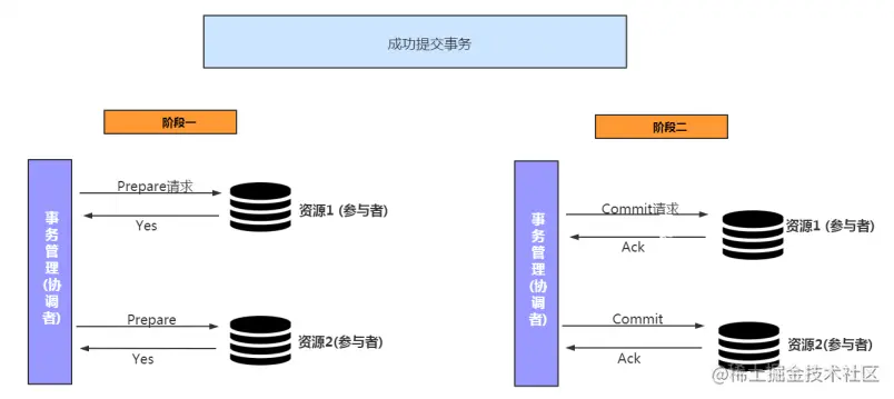 - 否则,发送提交(Commit)消息;参与者根据事务管理器的指令执行提交或者回滚操作,并释放事务处理过程中使用的锁资源。