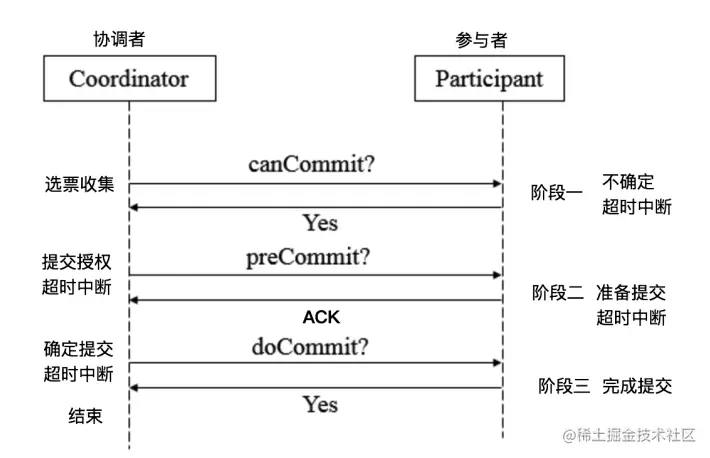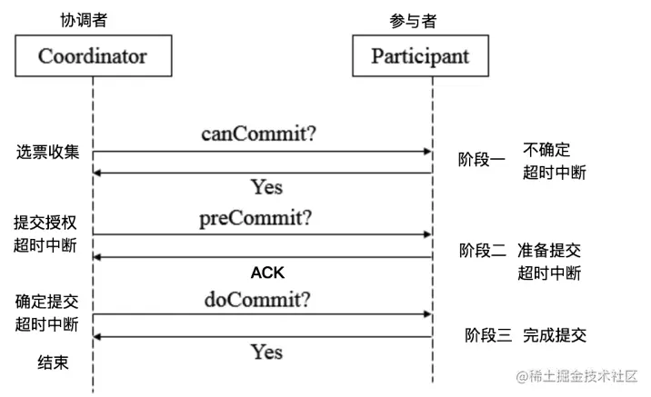 3PC,全称 “three phase commit”,是 2PC 的改进版,将 2PC 的 “提交事务请求” 过程一分为二,共形成了由CanCommit、PreCommit和doCommit三个阶段组成的事务处理协议。