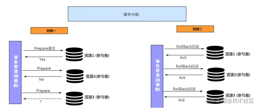 4. 中断事务: 协调者接收到所有参与者反馈的 Ack 信息后,完成事务中断。
