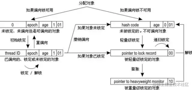 - 注:偏向锁在Java 6和Java 7里是默认启用的。由于偏向锁是为了在只有一个线程执行同步块时提高性能,如果你确定应用程序里所有的锁通常情况下处于竞争状态,可以通过JVM参数关闭偏向锁:-XX:-UseBiasedLocking=false,那么程序默认会进入轻量级锁状态。