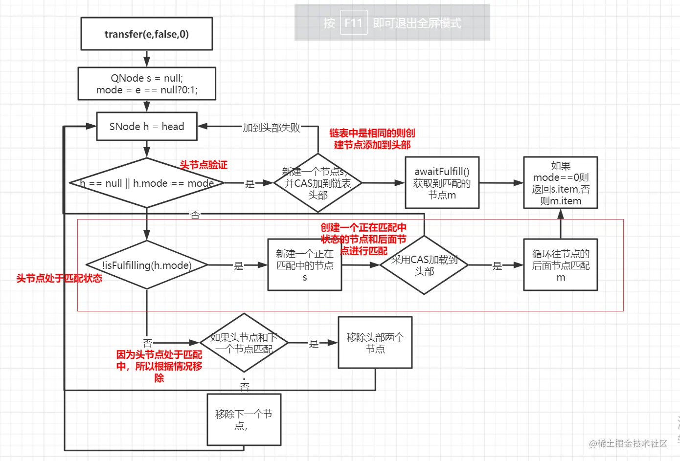 通过流程可以看到mode一个有三个值,除了0,1外还有一个2用来表示正在匹配中的节点。主要就是在上图中红框部分,在发现头部节点不是进行中时,当前线程就会创建一个匹配中的节点,然后加到头部,最后去和后面的节点匹配。