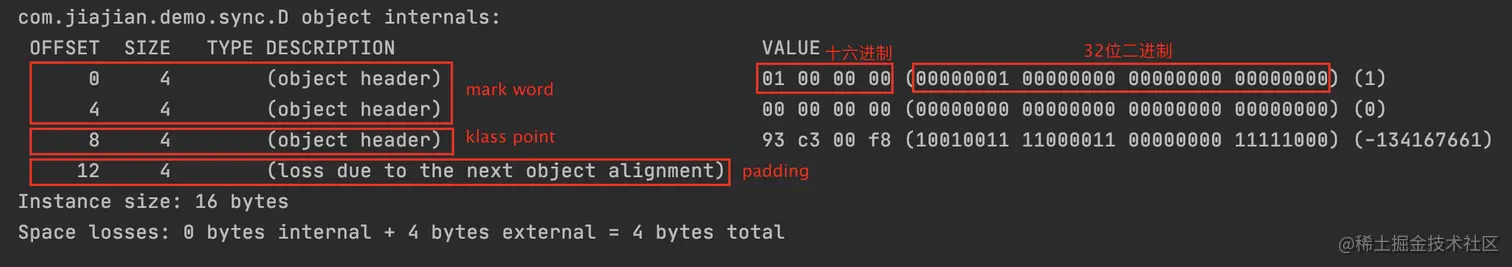 可以看到,d对象实例共占据16byte,对象头(object header)占据12byte(96bit),其中 mark word占8byte(64bit),klass pointe 占4byte,另外剩余4byte是填充对齐的。