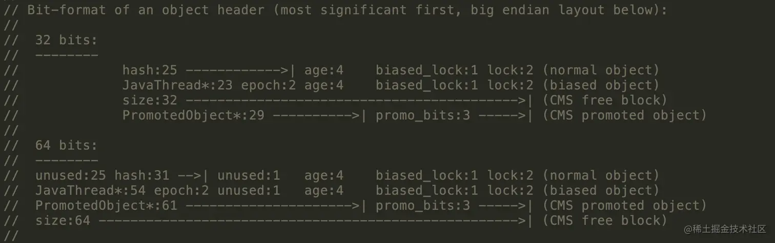 Mark Word在32位JVM中的长度是32bit,在64位JVM中长度是64bit。我们打开openjdk的源码包,对应路径/openjdk/hotspot/src/share/vm/oops,Mark Word对应到C++的代码markOop.hpp,可以从注释中看到它们的组成,本文所有代码是基于Jdk1.8。