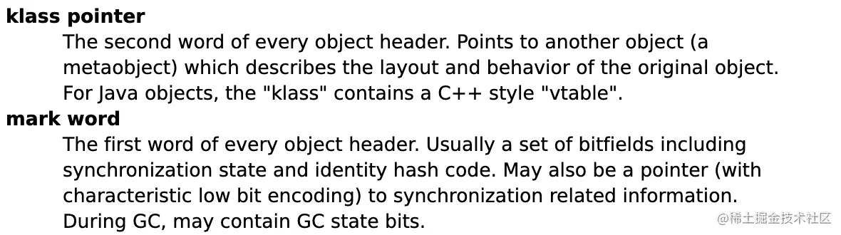 它里面提到了对象头由两个字组成,这两个字是什么呢?我们还是在上面的那个Hotspot官方文档中往上看,可以发现还有另外两个名词的定义解释,分别是 mark word 和 klass pointer。