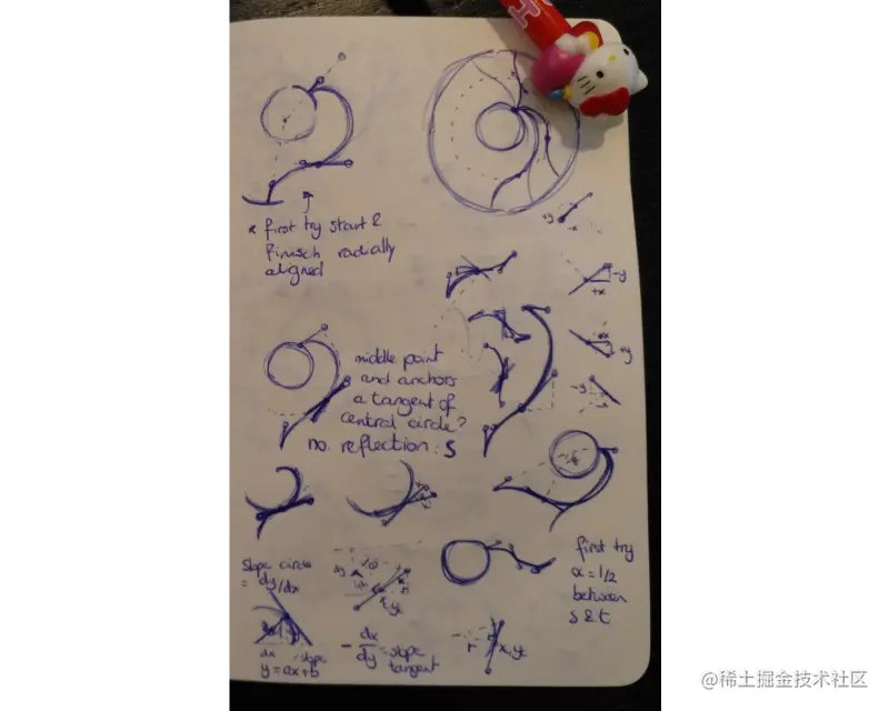 本月的另一个数学挑战是我最终未使用的一些东西......最初,我想用螺旋线将人物内圈与章节外圈相连(从技术上讲,两个相连的 SVG 三次贝塞尔曲线/SVG Cubic Bézier Curves)。为确保这些线将始终围绕内圈并看起来不错,我在素描本中花了大量的时间和注释!我总是喜欢画出我能想到的近似 SVG 路径形状,然后尝试找出应该放置的新点和锚点的位置。真正困难的部分是知道这些点和锚点在数据变化时如何相应变化,如何创建适用于所有实例的“公式”。