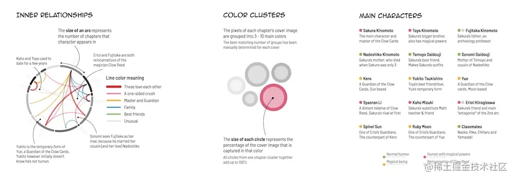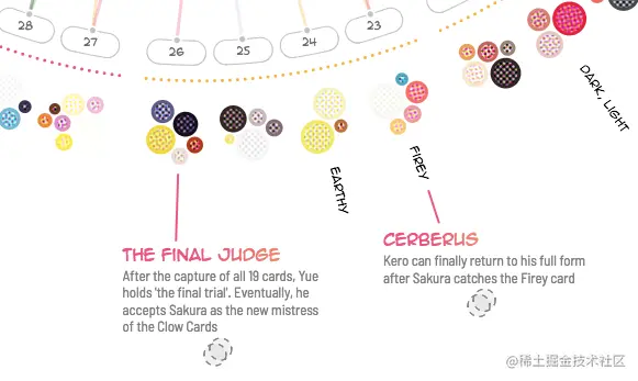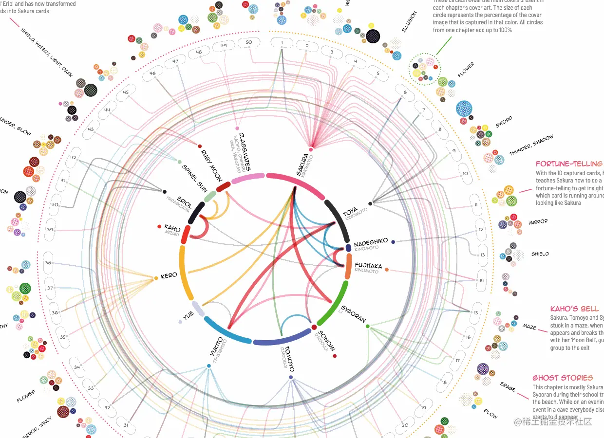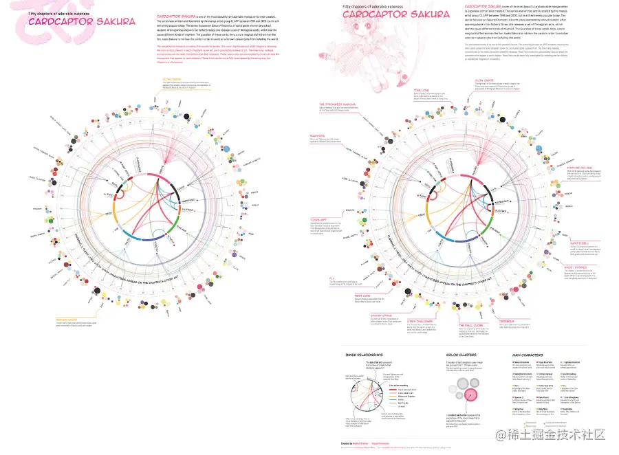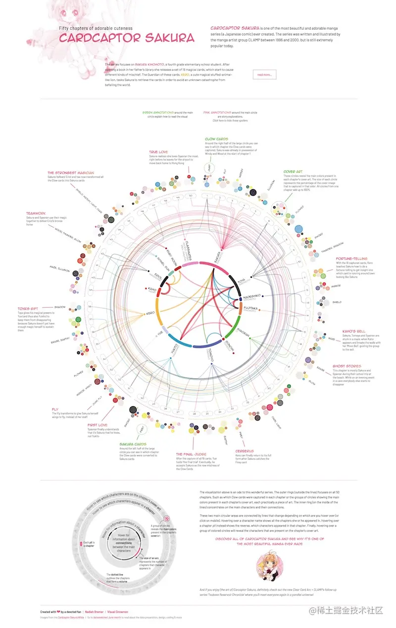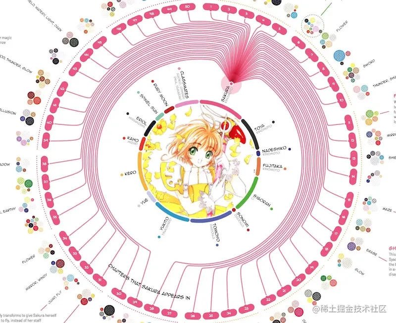 尽管如此,我对可视化的结果还是很满意的 :),我觉得我之前没有看到过类似的径向可视化作品。data sketches 总是尝试新的想法,所以当某个想法结果不错时总是件值得高兴的事^ _ ^希望您在交互这个可视化项目时会喜欢,即使您此前从未听说过「百变小樱」(很棒的漫画!相信我!)。
