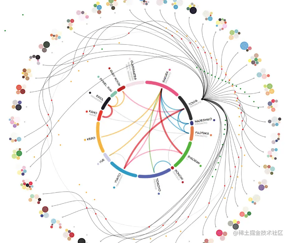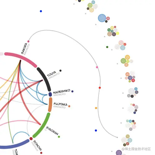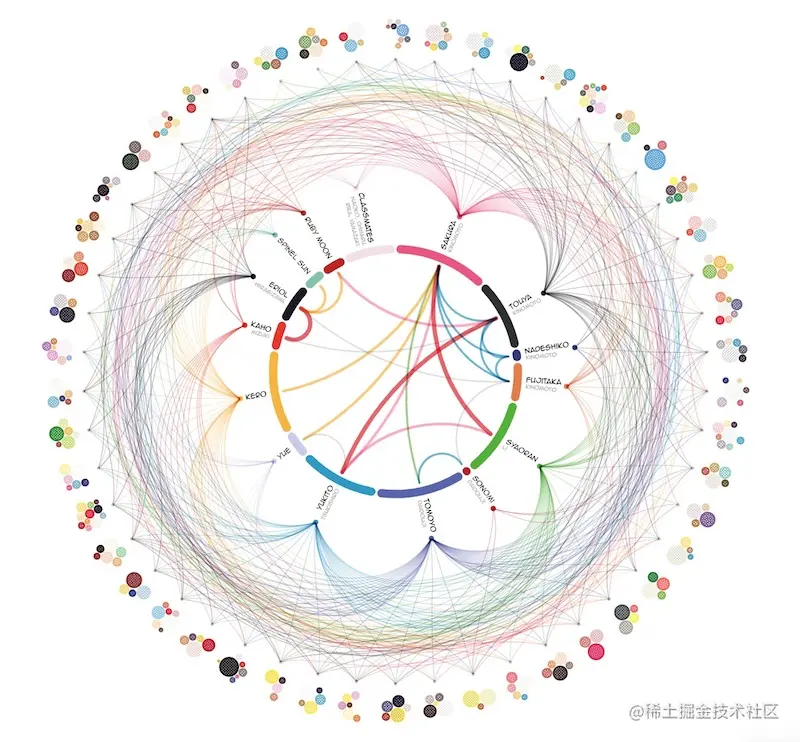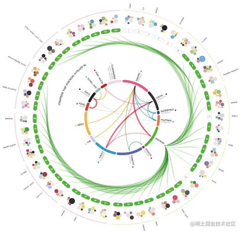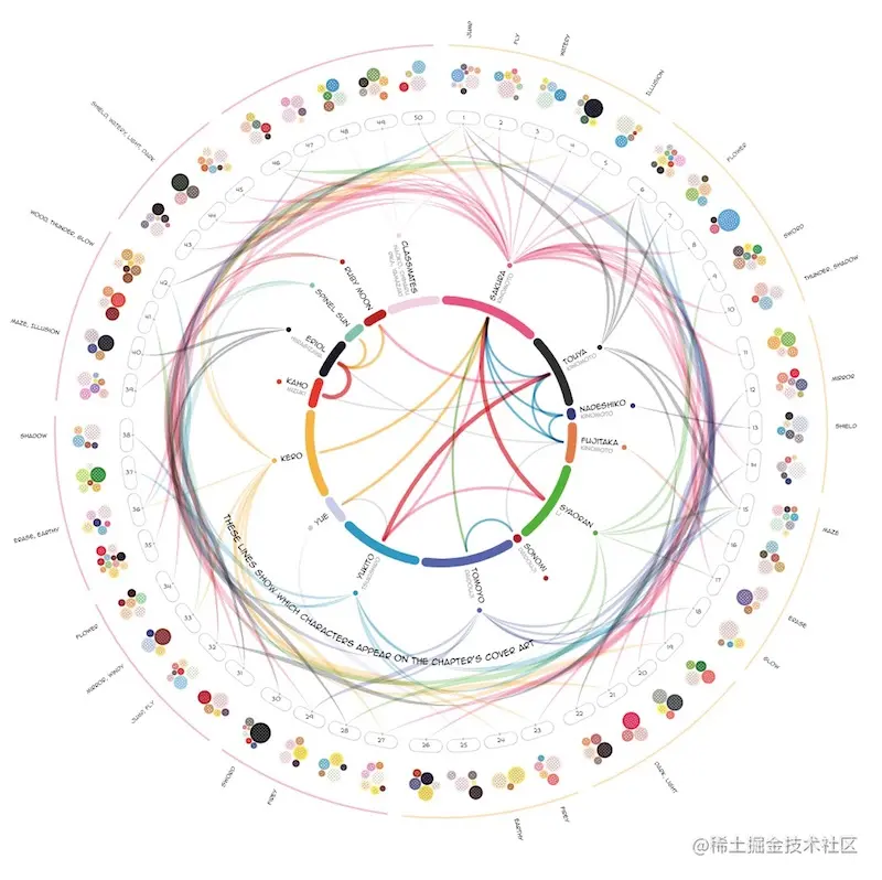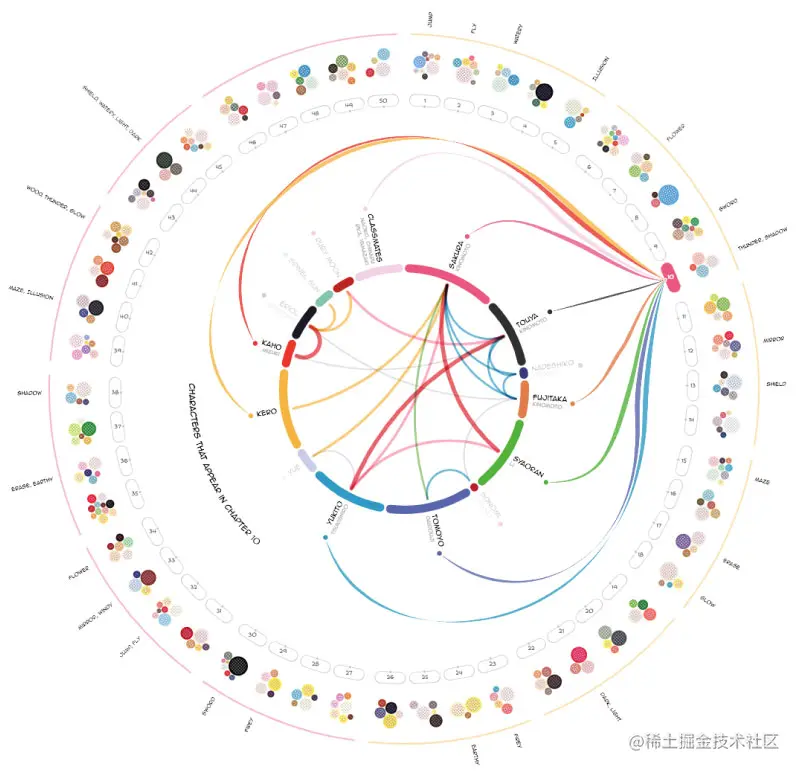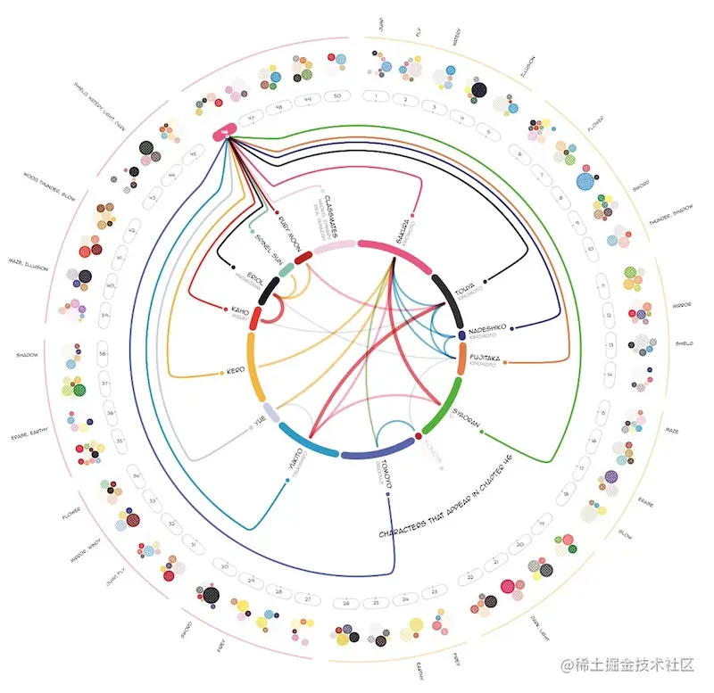 弄清本月可视化怎么设计的进展很缓慢。这更像多米诺骨牌效应,某个方面更具体的想法会导致后续另一方面数据探索想法的模糊(古柳:毕竟时间就那么多)。我从如何可视化颜色开始:漫画的每章用一簇带颜色的小圆圈表示,这似乎是合逻辑且有趣的一步;之后,将颜色簇以径向布局,也是显而易见的选择。尽管起初我想做一个半圆,颜色簇在右,人物信息在左。但是,因为有50章,就需要尽可能多的空间。 因此,这就是为什么我采用分层的方式,内圈小圆圈是所有人物,外圈大圆圈是所有章节的颜色簇,将这两个圆圈用线连接起来,以显示哪些人物出现在哪些章节中。