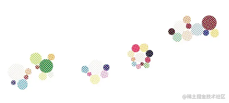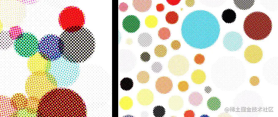 最终,我得到了视觉上的另一种可选方案,并且看起来像是我想要的。首先是平滑的边缘,点在边缘部分会变小,但是整个 CMYK 点仍然是完整的点,而且,我还可以在两个圆的 CMYK 效果都可见的情况下,画出彼此重叠的圆。
