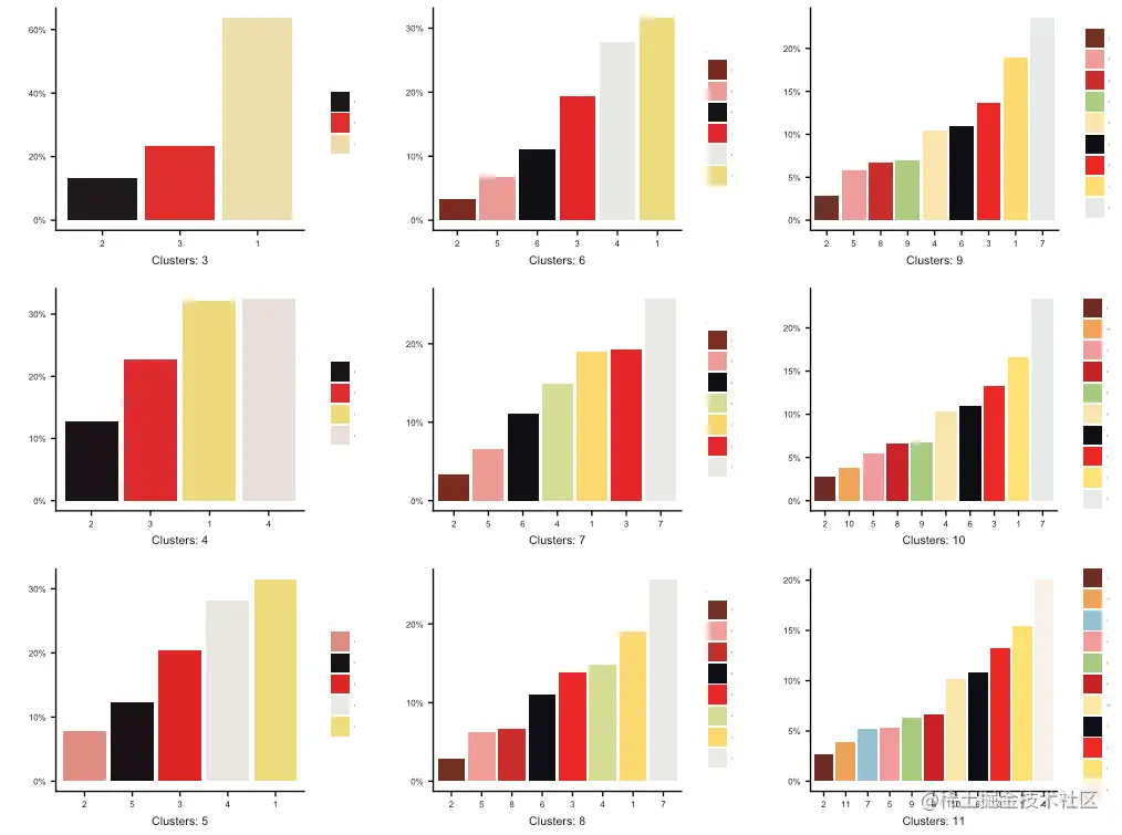 但是,使用 K-means 有个棘手问题是要确定使用多少个聚类数来进行分组。起初我尝试结合分层聚类来使用,但最终还是决定用自己的眼睛来判断,可能会更好(虽然更耗时)!我为每一章都创建了一张下面的图,该图显示了抽取3-11(不想过多)个颜色簇时各自的颜色分布。然后,我将实际封面与这些分相比较,选择了最合适的一组:在捕获所有颜色和很好地融合不同颜色之间取得平衡。其中最佳分组的十六进制颜色 hex colors 及其百分比 %s(柱形高度)保存到 json 中后面会用到。