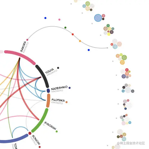 细心的人会注意到,我实际上实现了两种略有不同的线条“类型”。默认情况,不悬浮,或悬浮在人物与颜色簇上时,会绘制一种;当鼠标悬浮在章节上时,会绘制另一个。可自行尝试,看看区别。