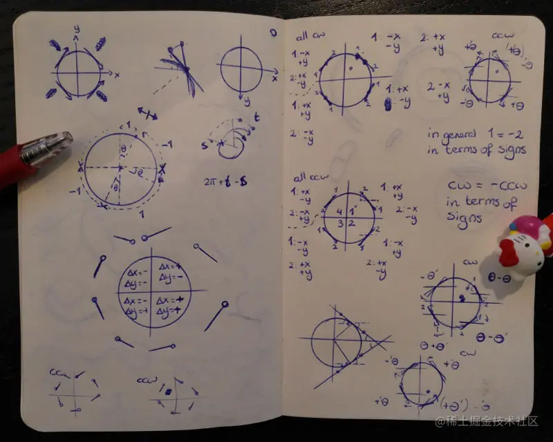唉,我甚至不敢回想我是怎么一步步得到想要的线条的。我的草稿中大多数注释都和这部分有关。因为当线逆时针而不是顺时针旋转时,需要做些略微不同的事情。如果您把所有事情都搞砸了,那么就像会像下图这样......